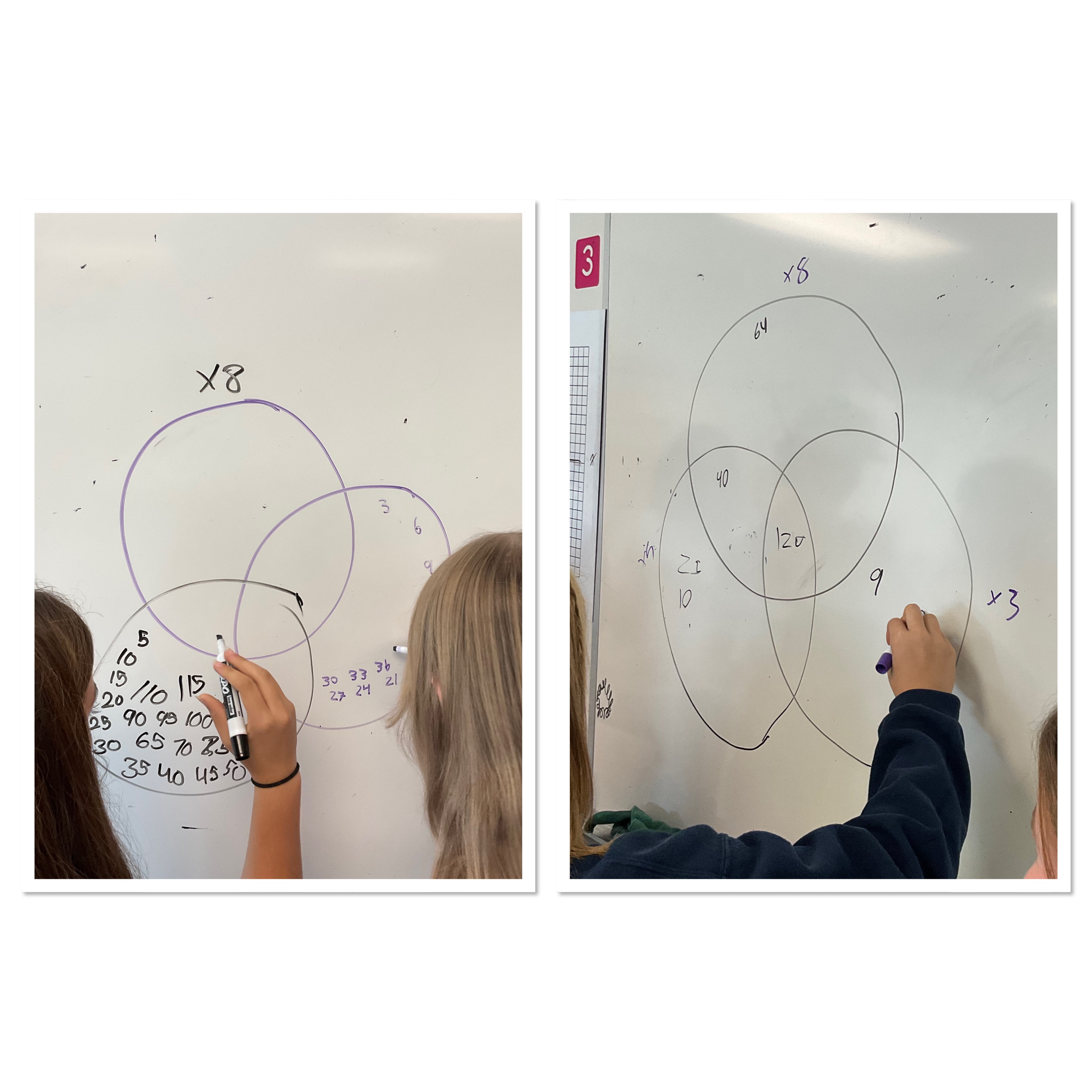 we had an interesting time filling in the sections, and saw some patterns emerge. In the circle that had all the multiples of 8 the numbers were all even. In the circle with multiples of 5 the numbers ended in 5 or 0. In the central section all of the numbers ended in 0 since they had to be a multiple of 5 that is even.