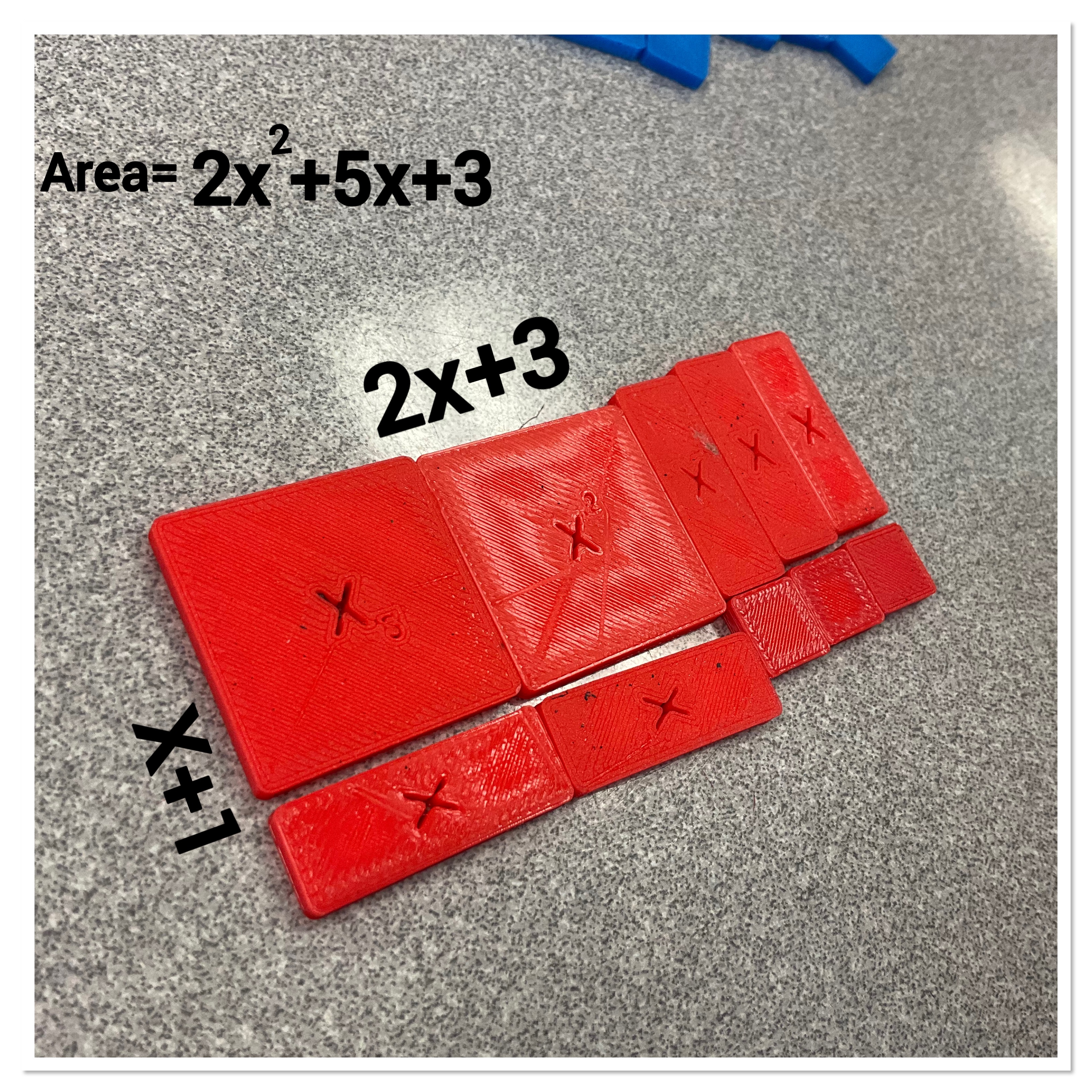 My 2D class started working on factoring and expanding today using tiles. We spent a lot of time building rectangles with tiles, and determining the dimensions and the areas. Long sides are named x, and short sides are named 1. Long sides touch long sides, and short sides touch short sides. We have to be careful about colours of tiles, remembering that (-)(-)=(+) and (+)(-)=(-).