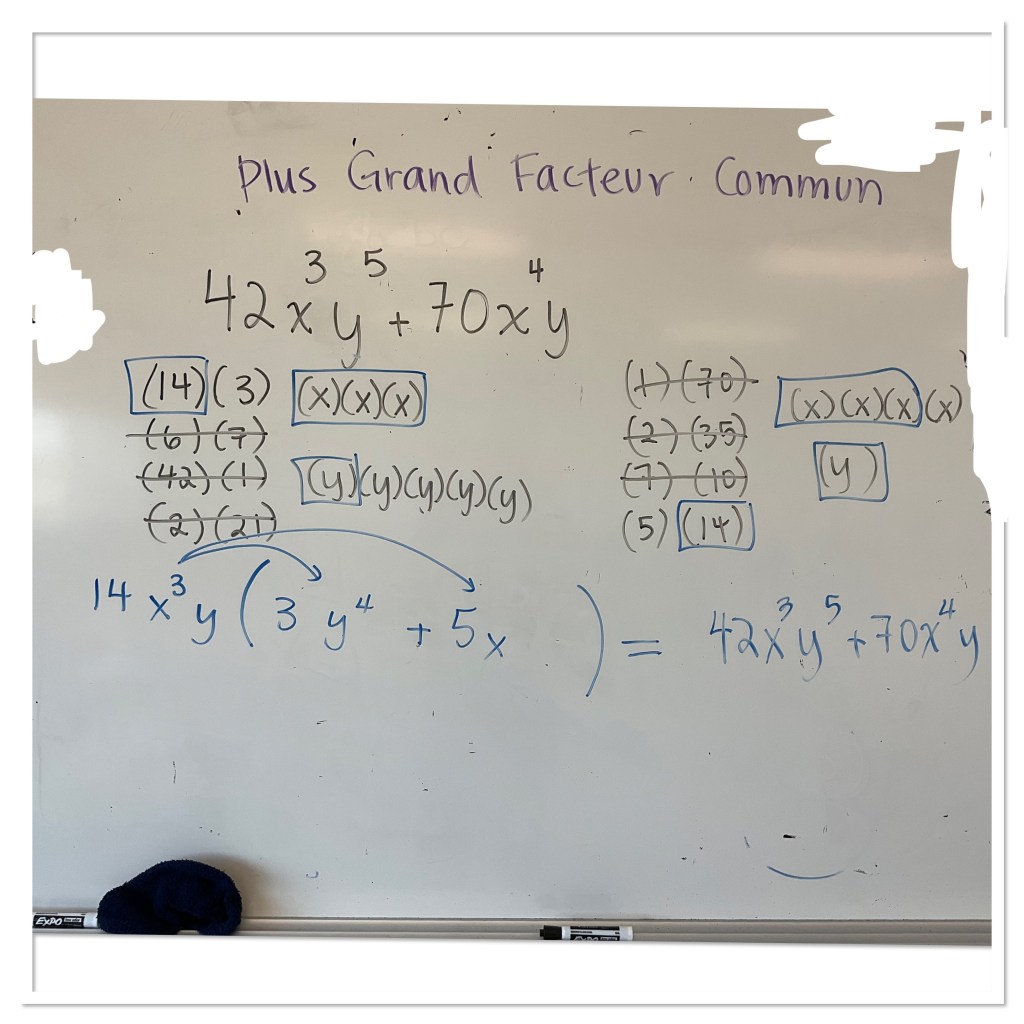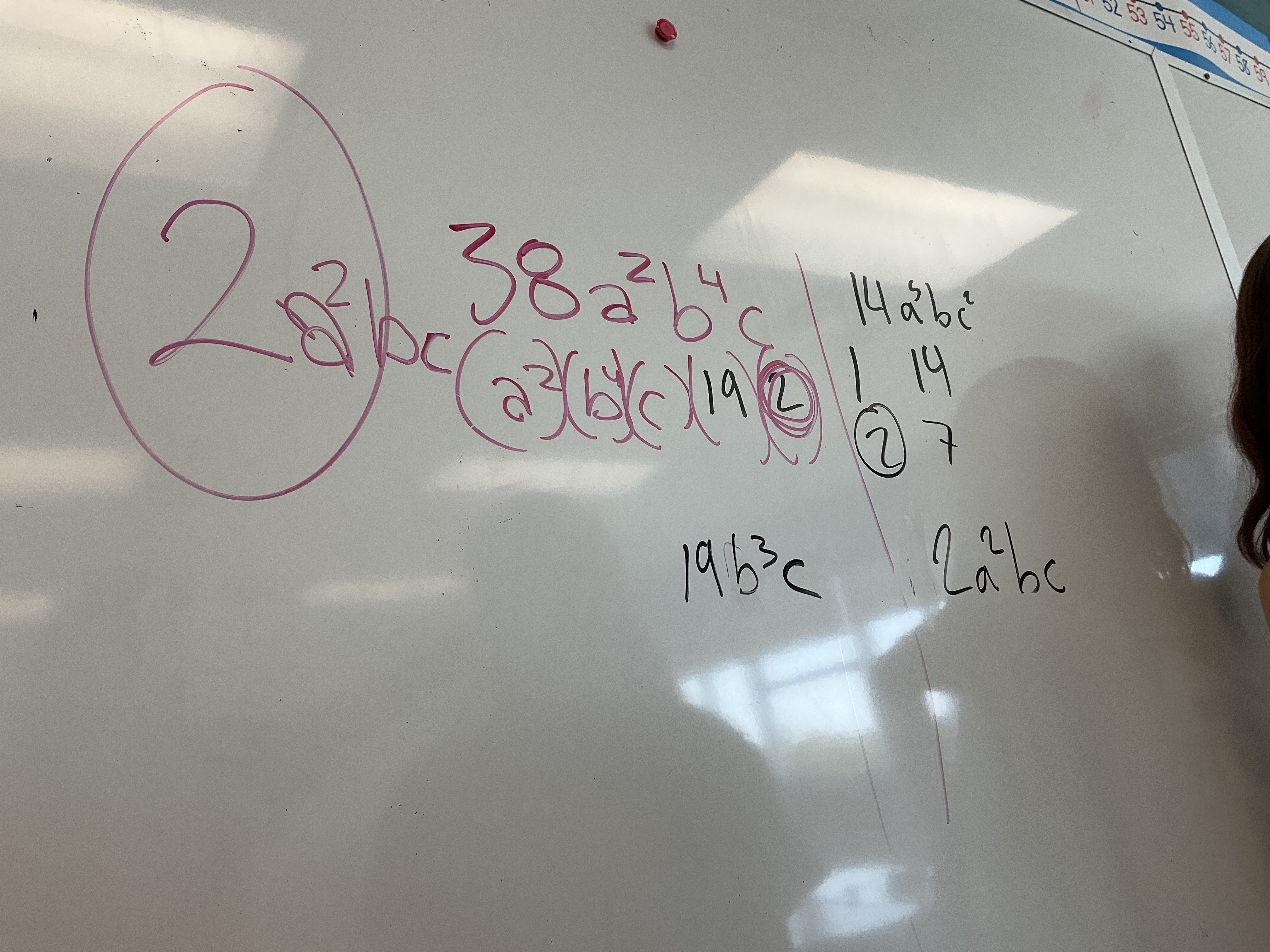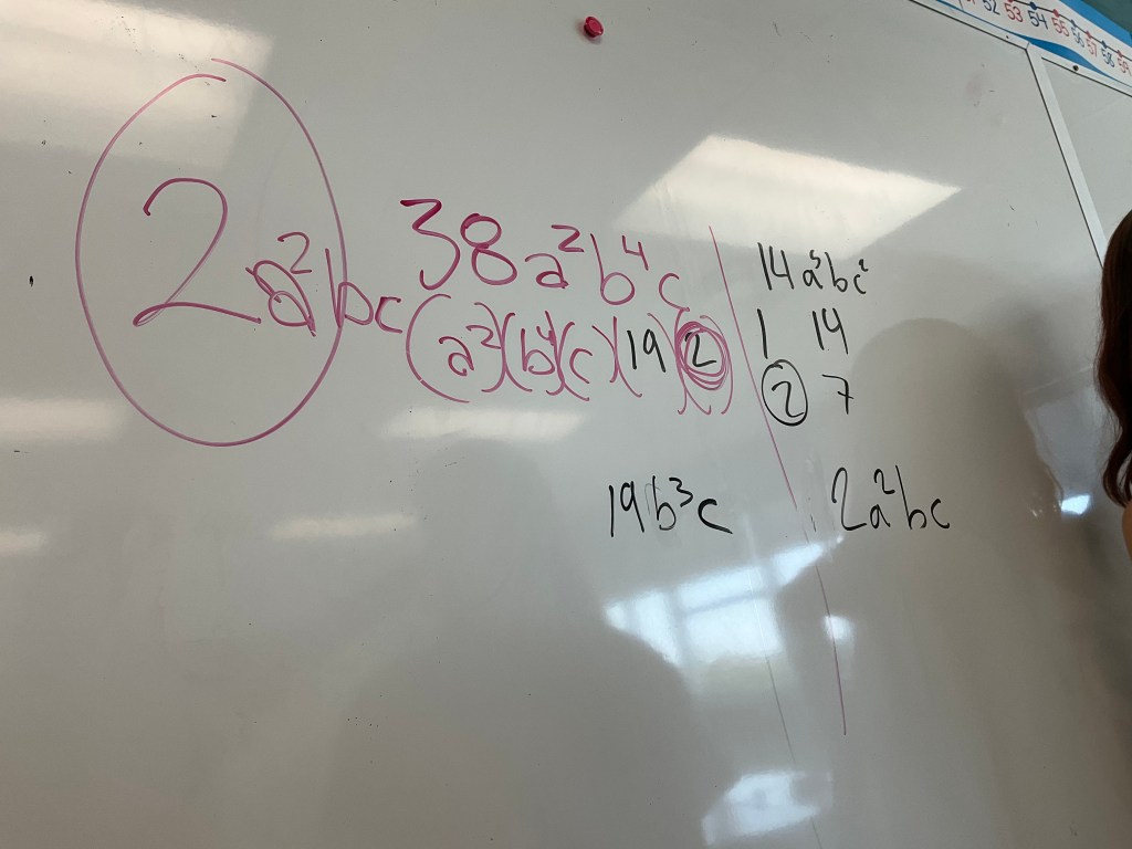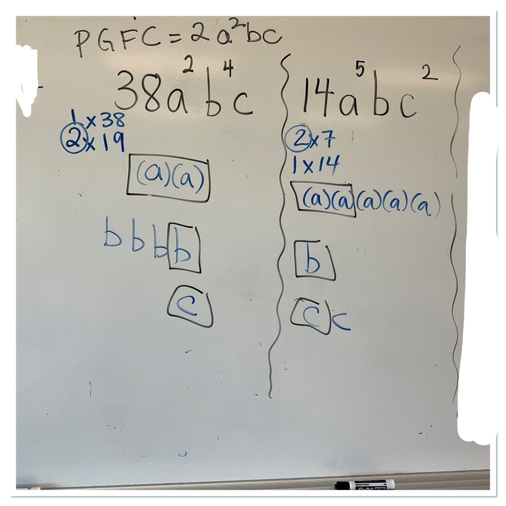 Next we looked at 38(a^2)(b^4)(c) and 14(a^5)(b)(c^2). Students were working on how to represent the factors and find the greatest common factor of 2(a^2)(b)(c). They also started to group the “leftovers” together.