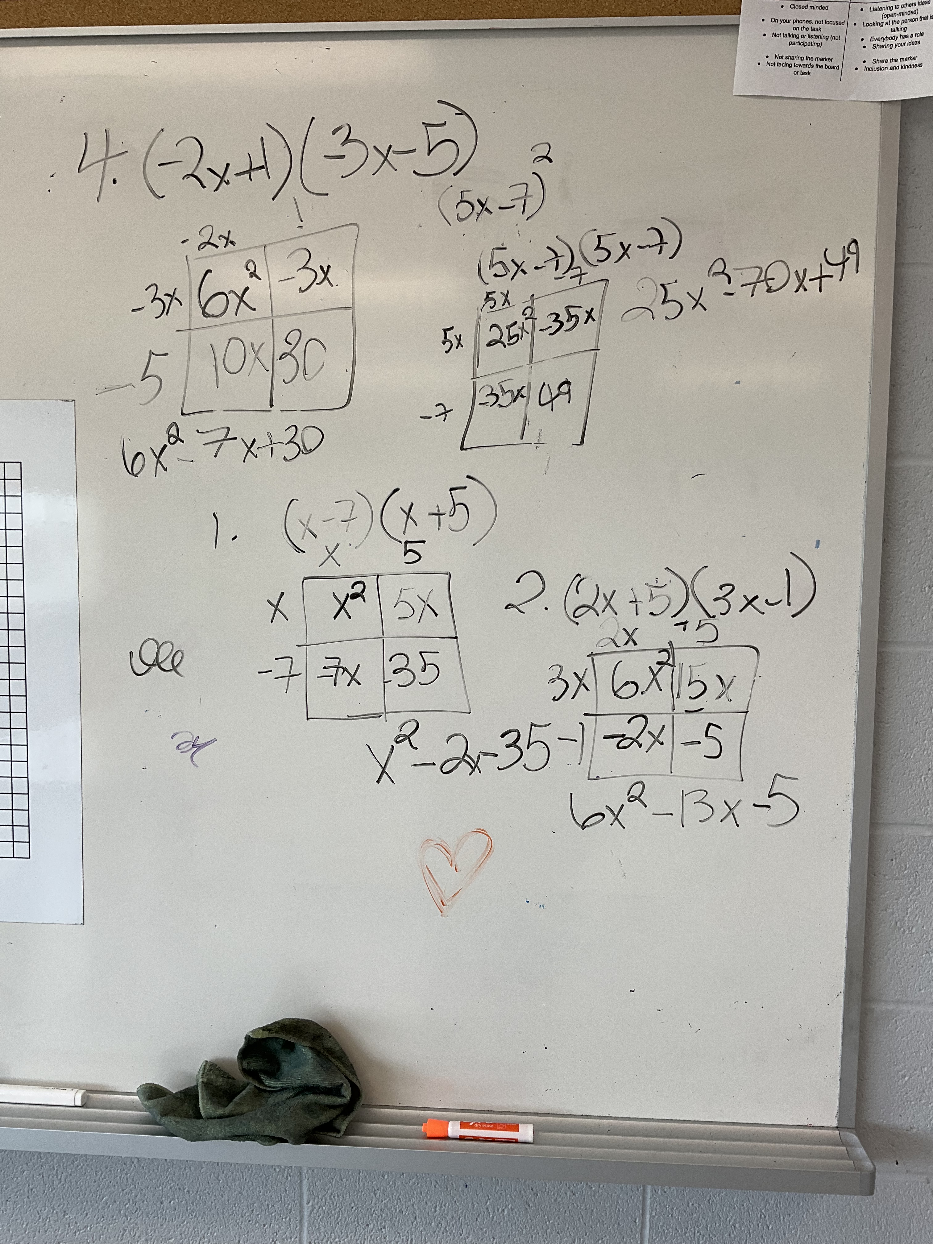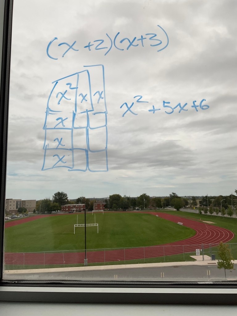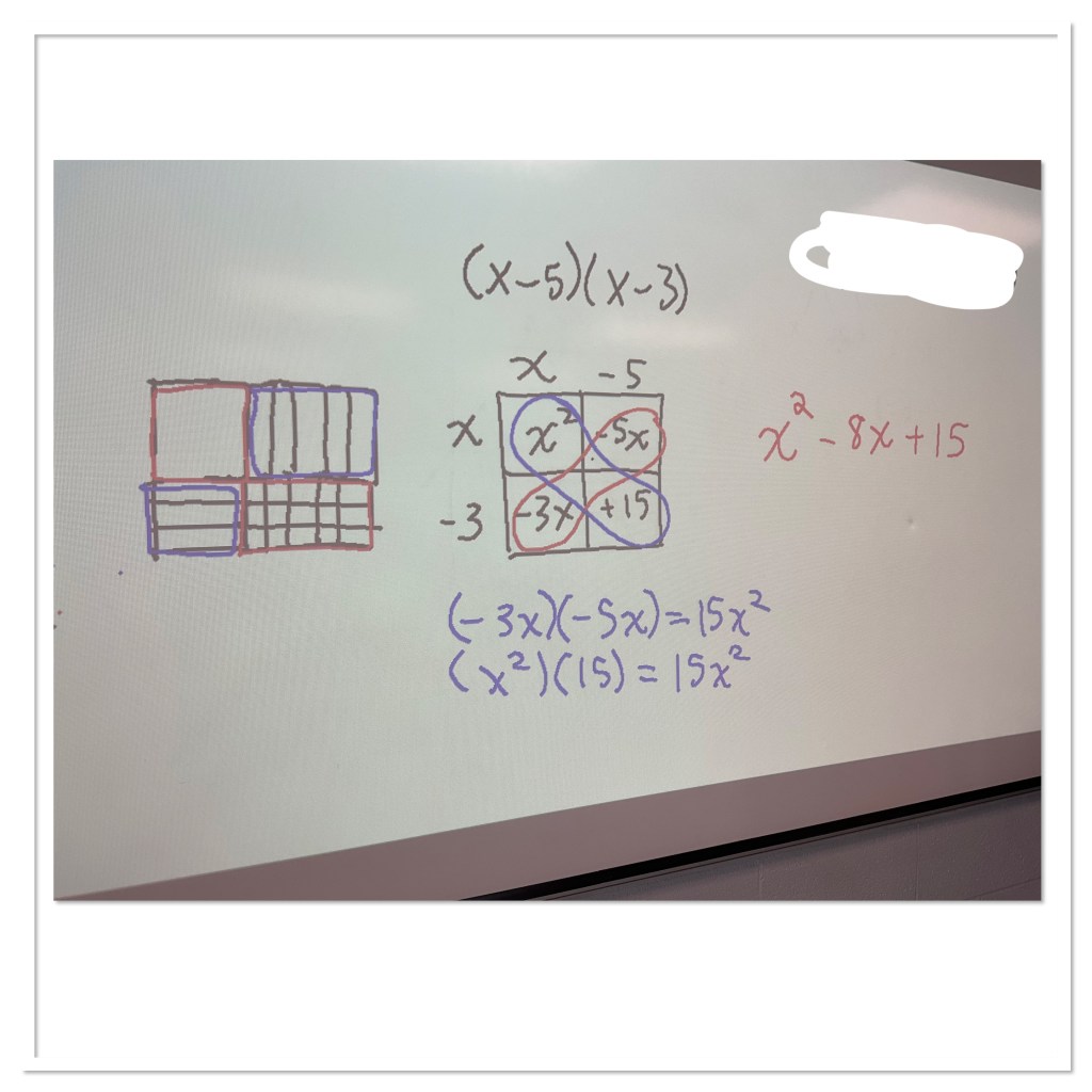 Today my grade 10 class worked on multiplying binomials using tiles and again using the area model.