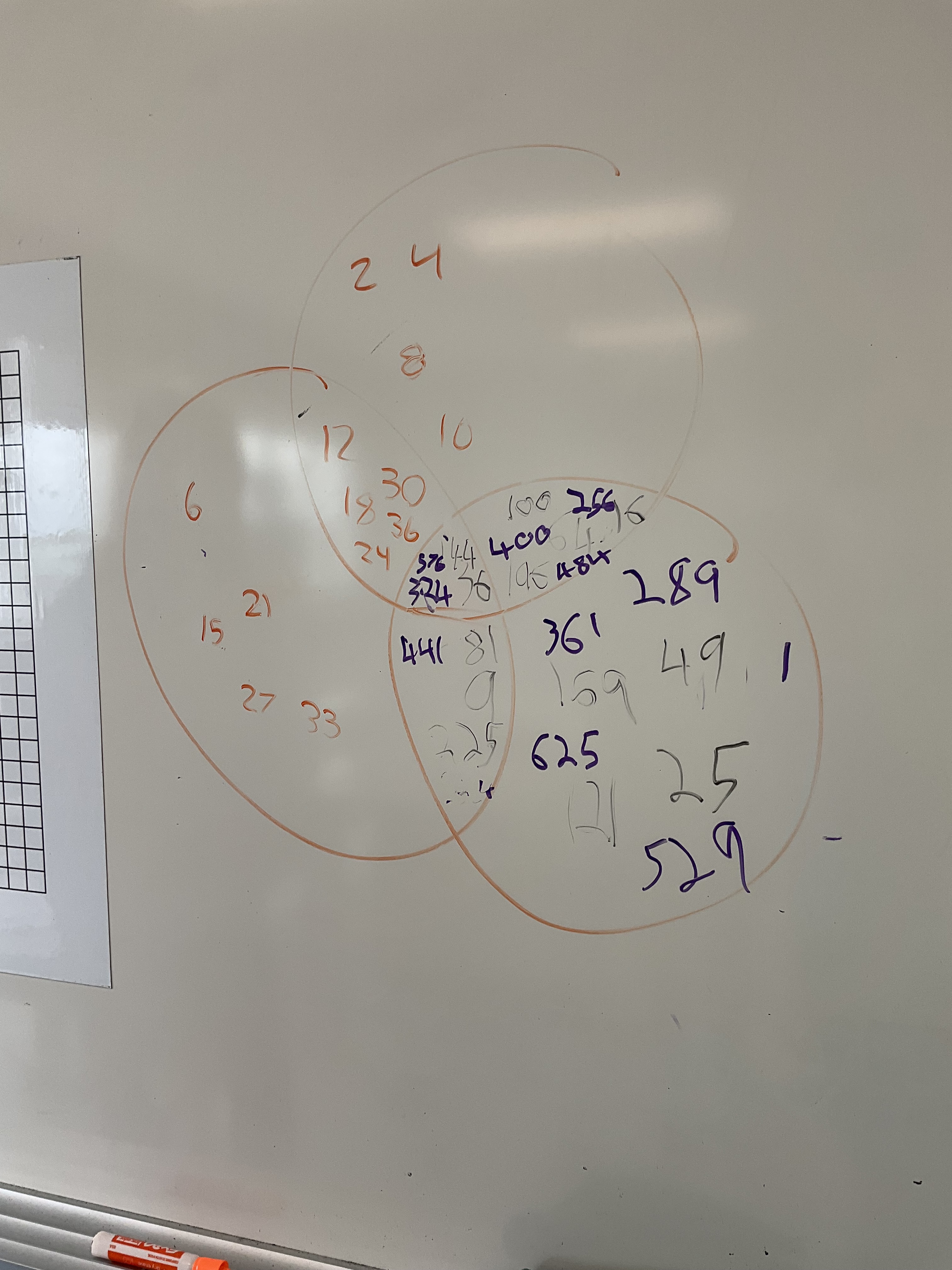 Since it’s Vennsday we did another numeracy task with Venn diagrams. This time we had one circle for even numbers, one for multiples of 3, and one for square numbers.