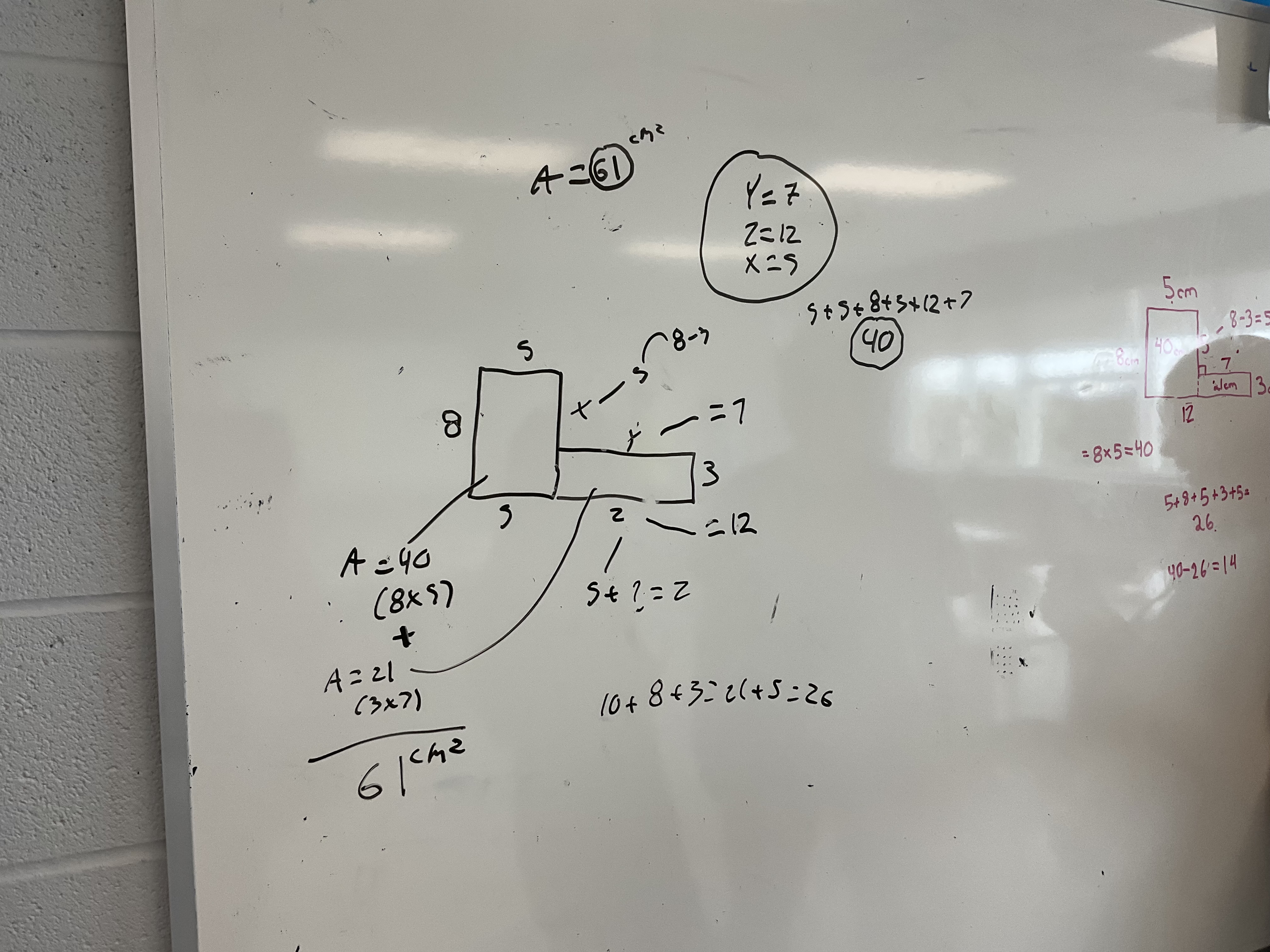 We needed to use some logic to determine the missing side lengths, and then find the area of each rectangle, and then add them up.