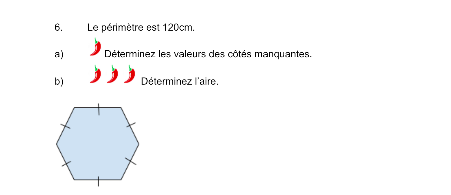 A regular hexagon is made of 6 equilateral triangles, and the sides are all 20cm.