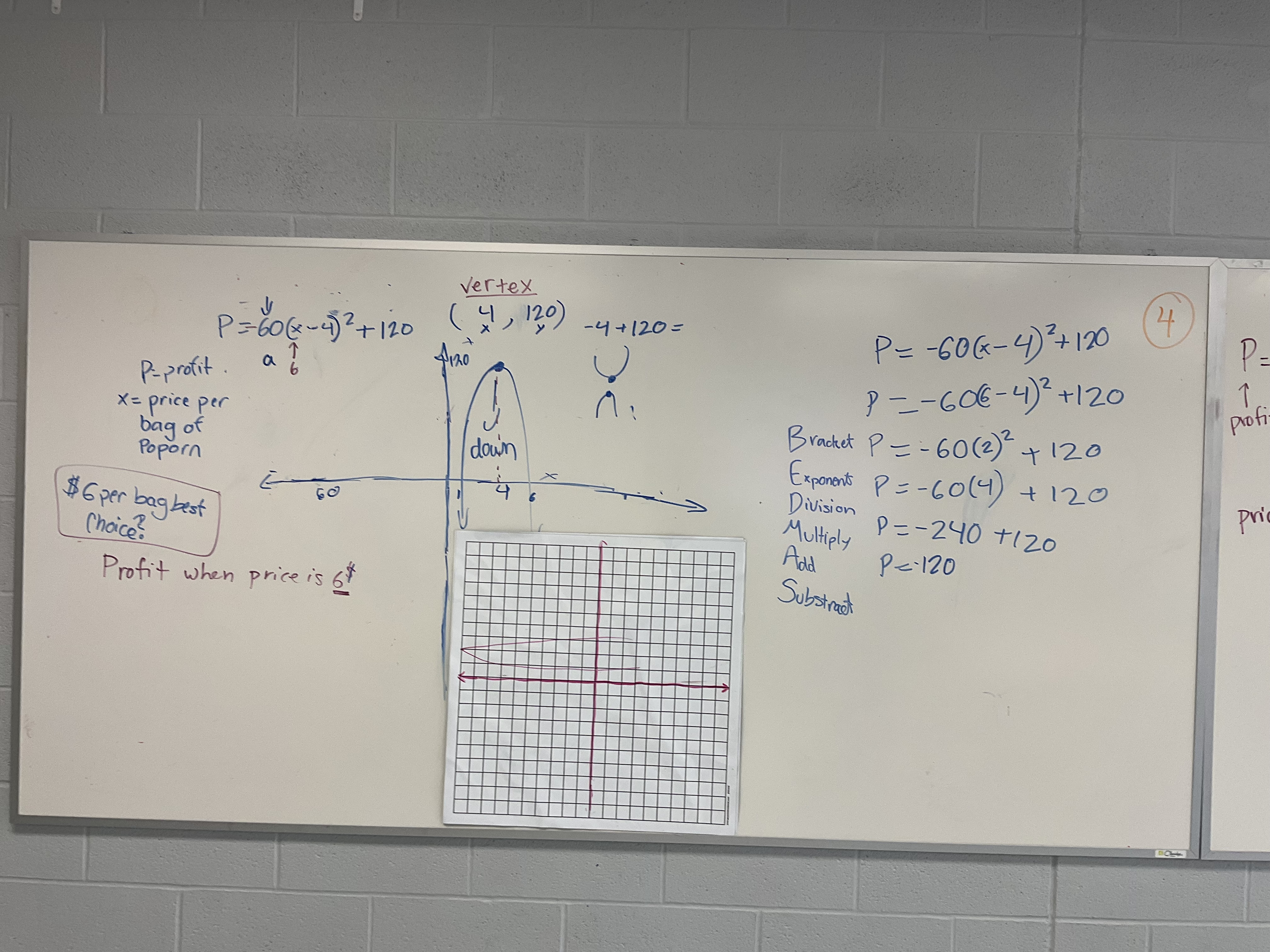 I gave the students a scenario of someone seeking riches through popcorn sales. They have talked with a business analyst who gave a profit equation. P=-60(x-4)^2+120, where P is profit and x is price of a bag of popcorn. I asked them if my friend’s plan of selling a bag for $6 is a smart plan.