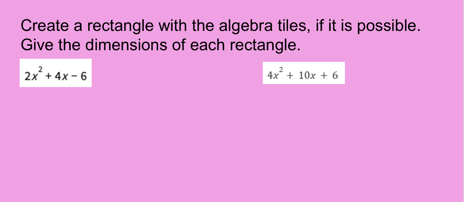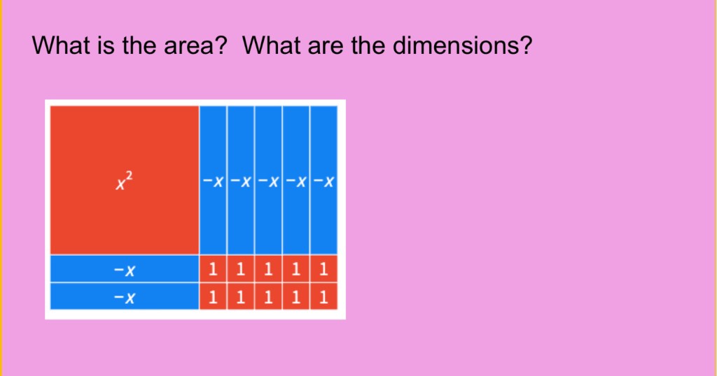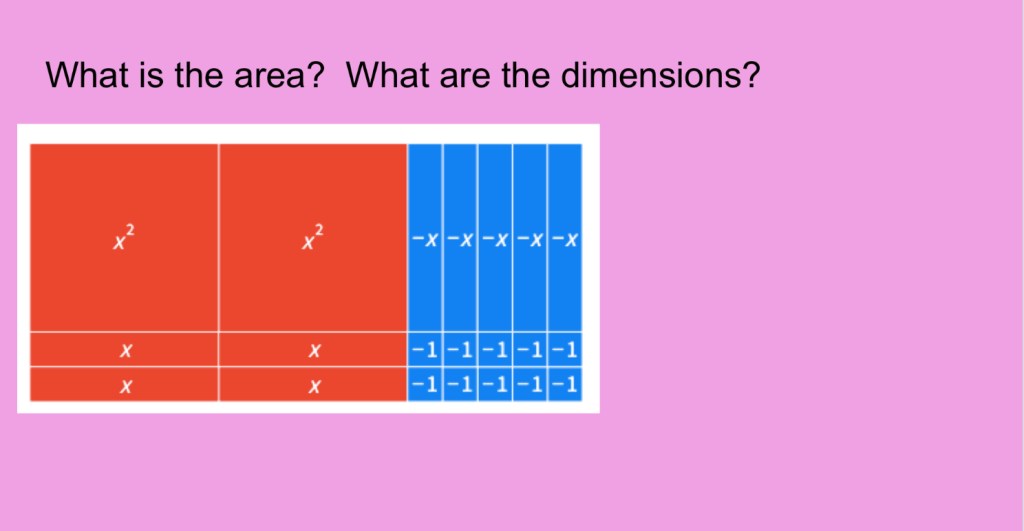 Today I had the pleasure of working with a grade 10 academic math class to help introduce factoring and expanding using algebra tiles.