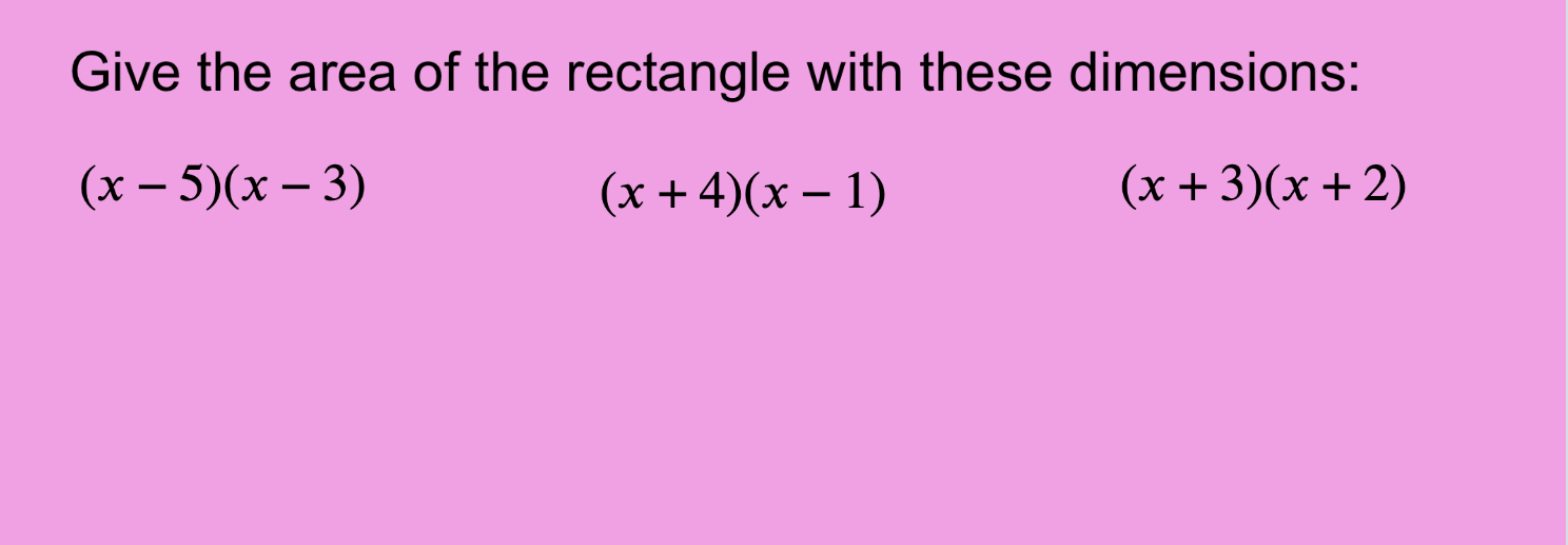 To start with, students were working on recreating the rectangles provided and stating their areas and dimensions. Here is the sequence of questions we used.