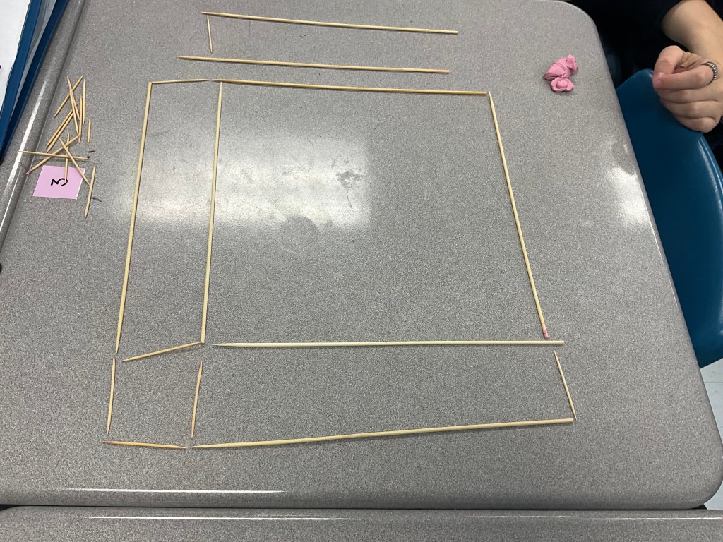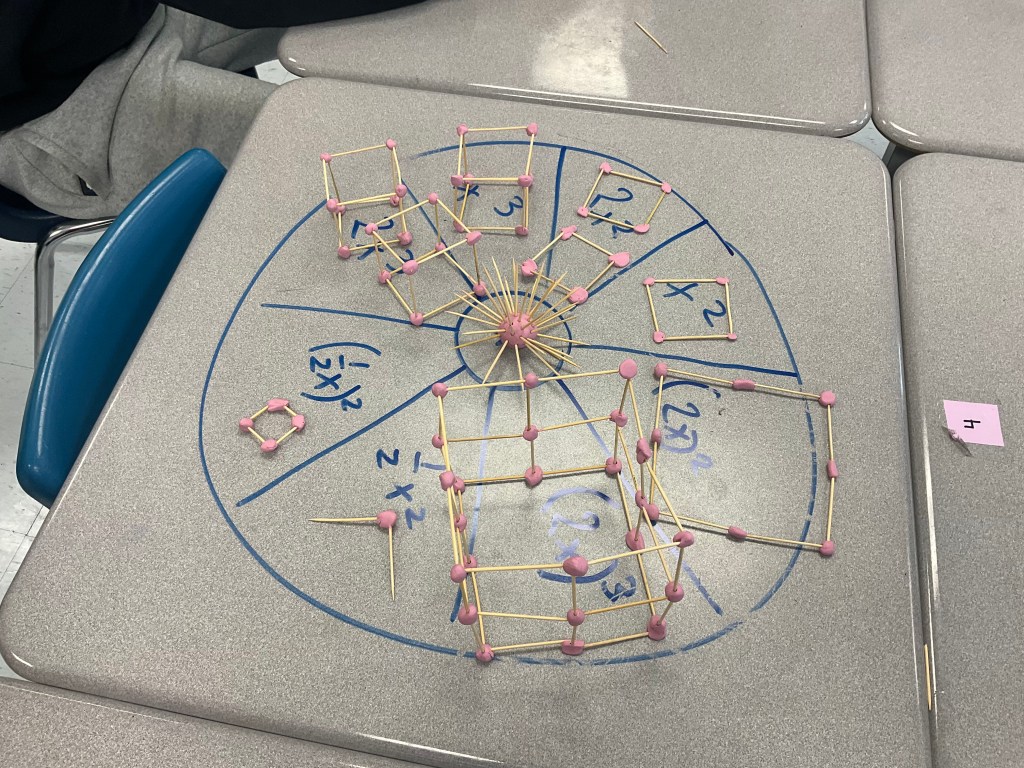 Today my grade 9 class built exponent models using toothpicks and plasticine. The mild version included x^2, x^3, 2x^2, 2x^3, (2x)^2, (2x)^3, 1/2x^2 and (1/2)^2.