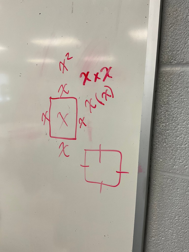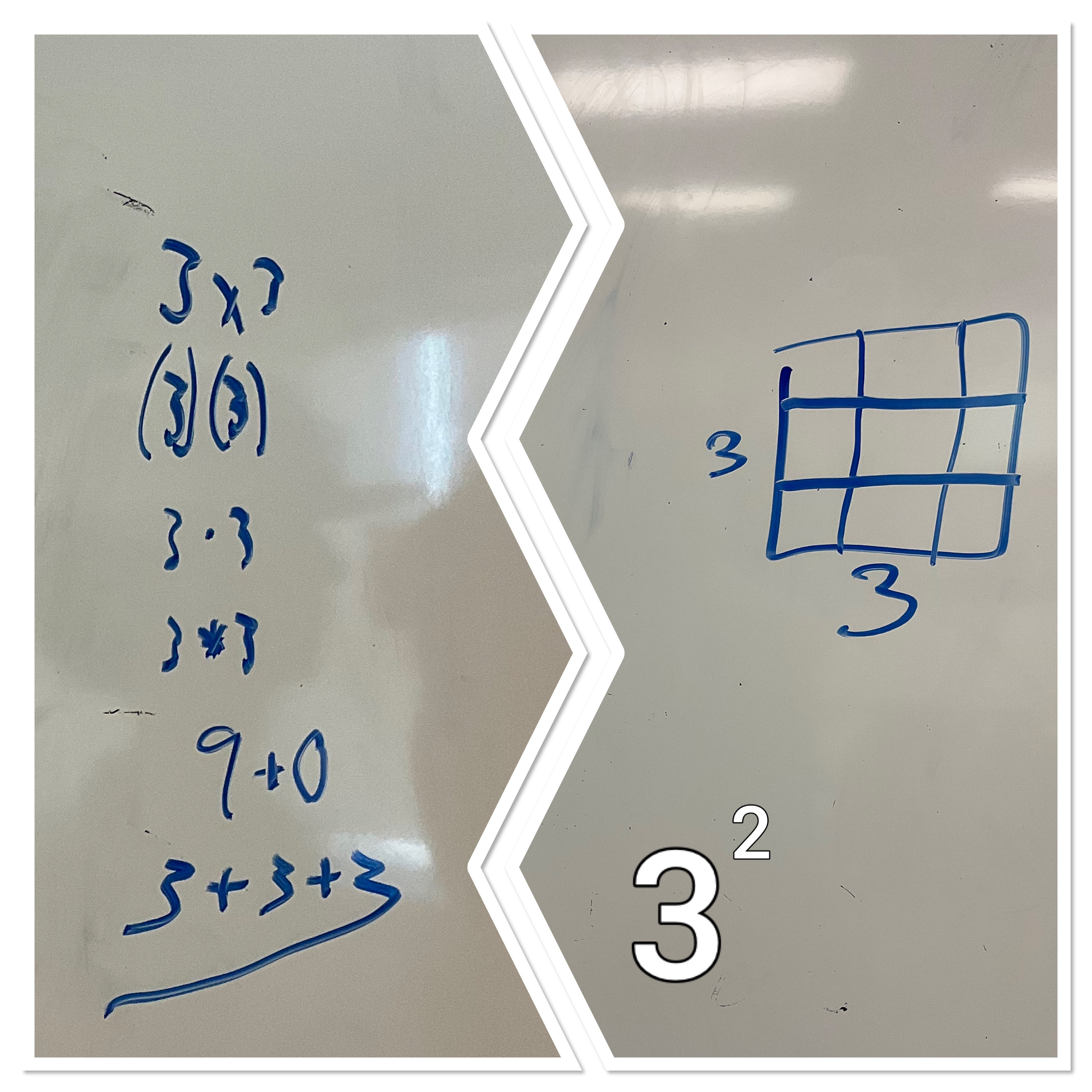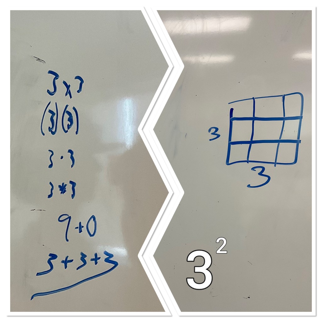 Following what we did yesterday, we know that the exponent 2 means to make a square. The side lengths are 3. We know we can write (3)(3) in many ways as well.