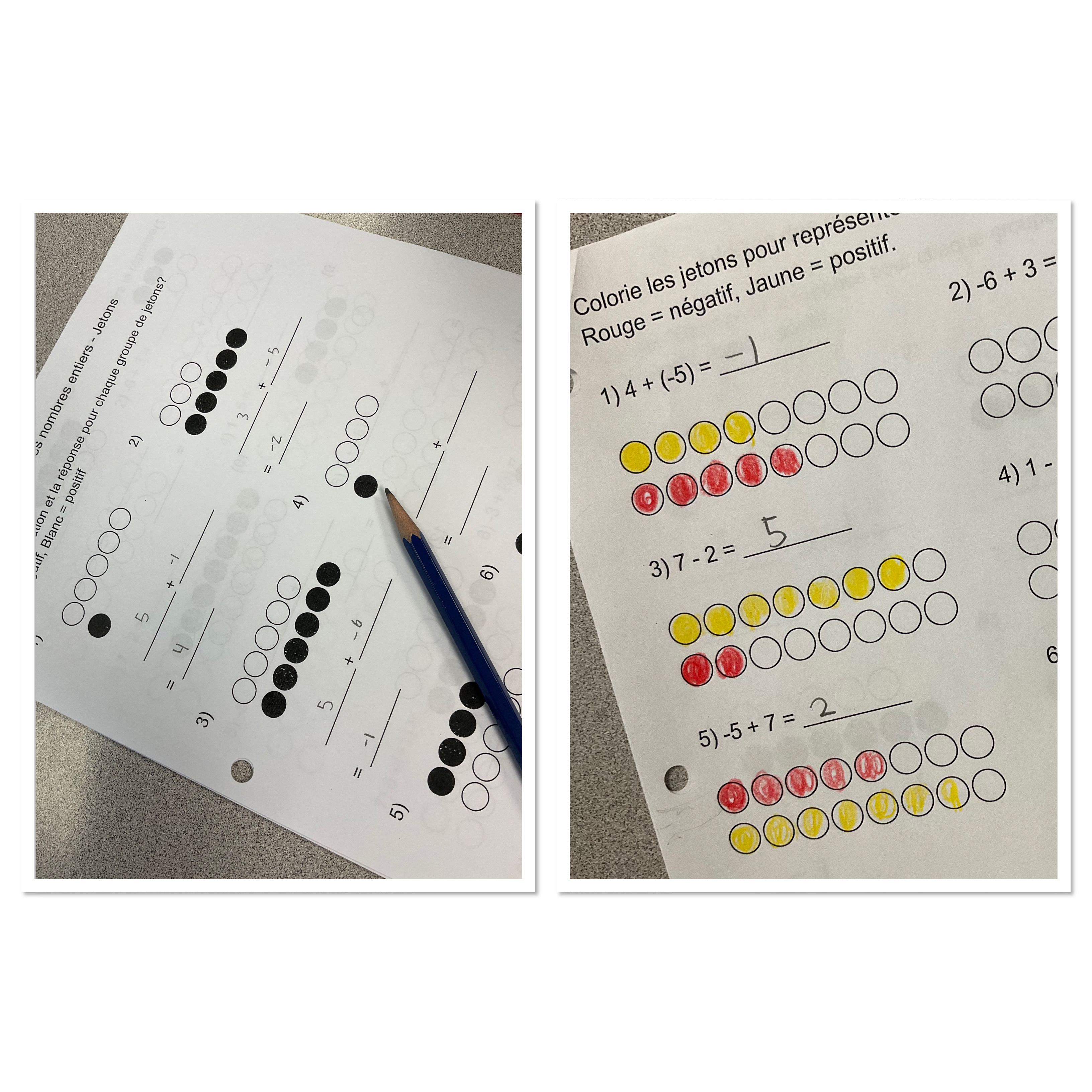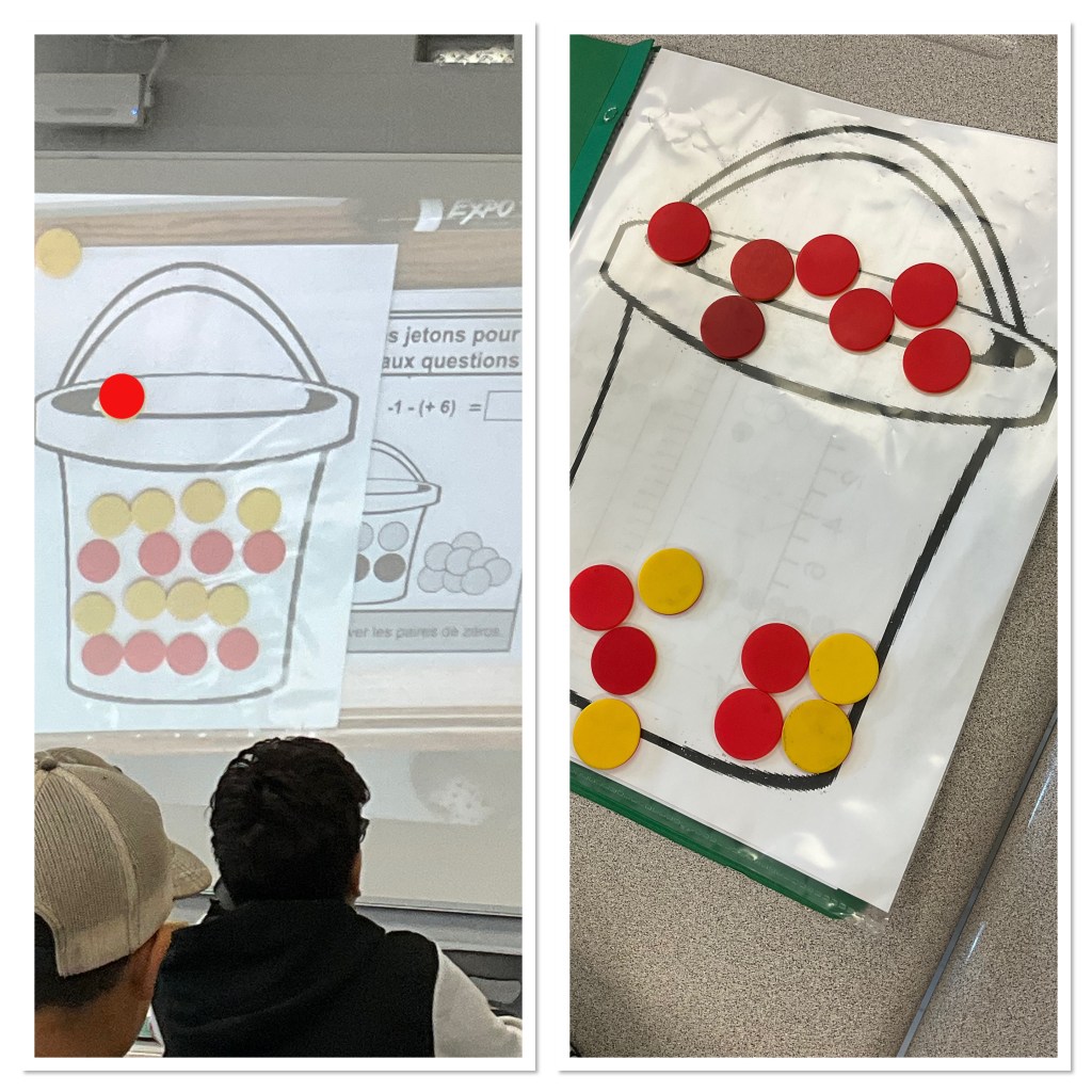 They were working with counters to create a bucket of zeros, and using that to represent operations with integers. Thos particular question was an adding question and didn’t need zeros in the bucket, but yellow represented positive, and red negative and students knew to add the quantities together and create zero pairs and see that there is -1 that remains as their answer.