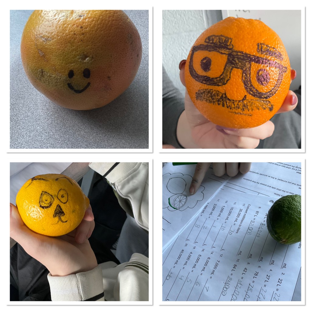 In MAT1L this week students have been investigating citrus fruits. There are 5 teams, each with a different fruit to explore.