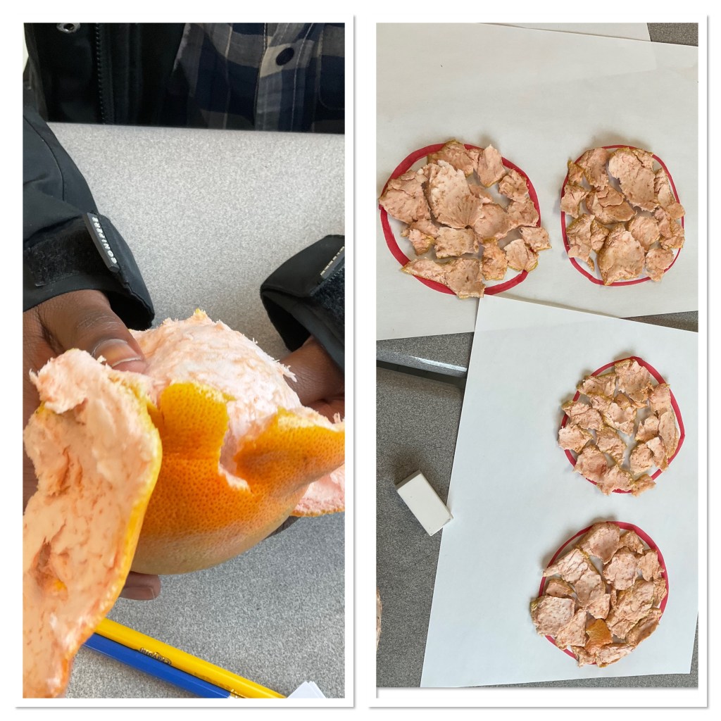 Next we peeled the fruit, and looked at how many circles the peel would fill in. We made circles the same size as the original fruit. It’s pretty cool that the peel will fill 4 circles. The surface area of a sphere is 4(pi)(r^2) which is 4 times the area of a circle with the same radius.