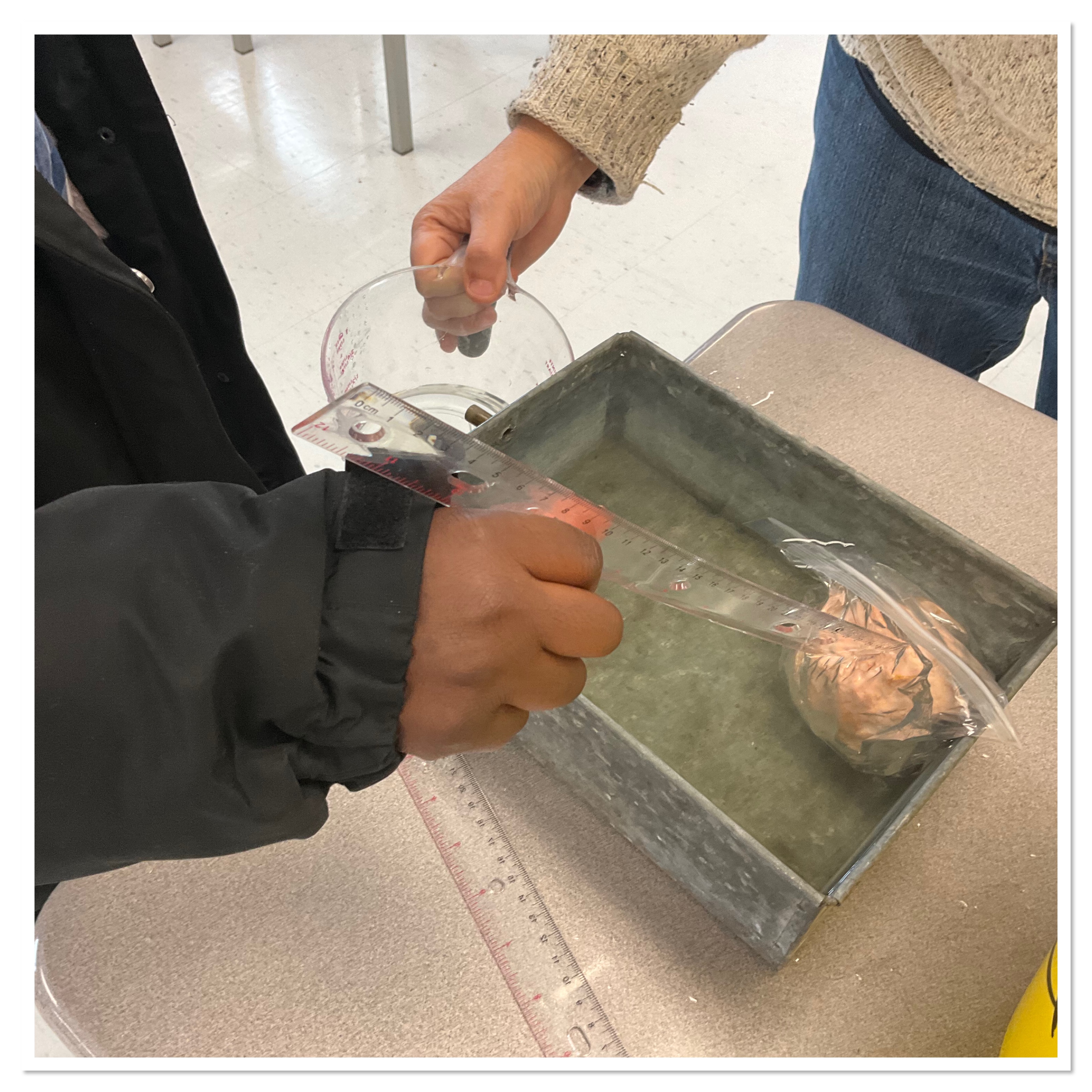 We estimated and measured dimensions (length, width and height) in inches and cm, we estimated and measured the weight. We estimated and measured the volume in cups and in mL. We used a displacement tank to find out the volume. Here is Gerold the orange having a bath in the displacement tank.