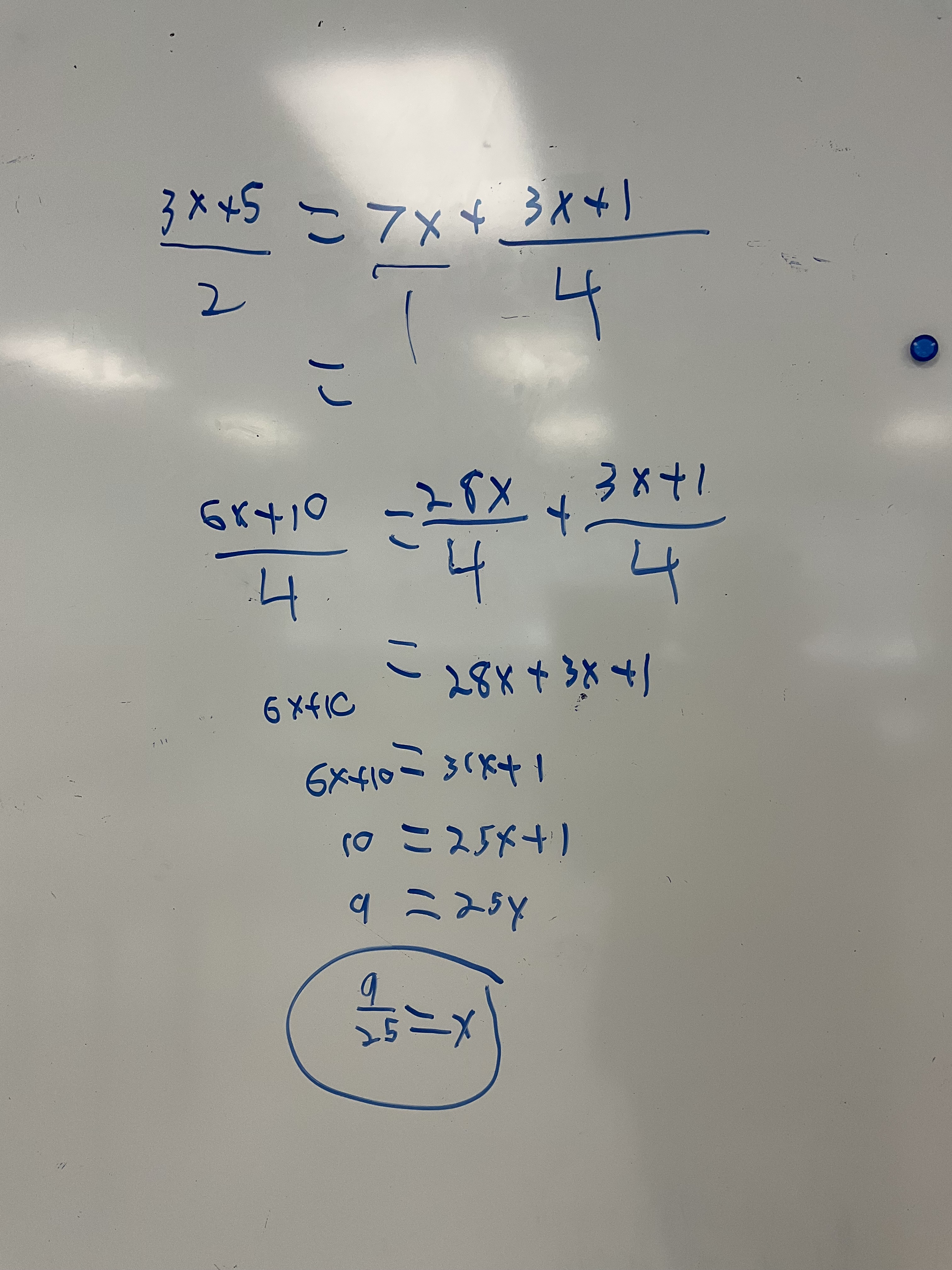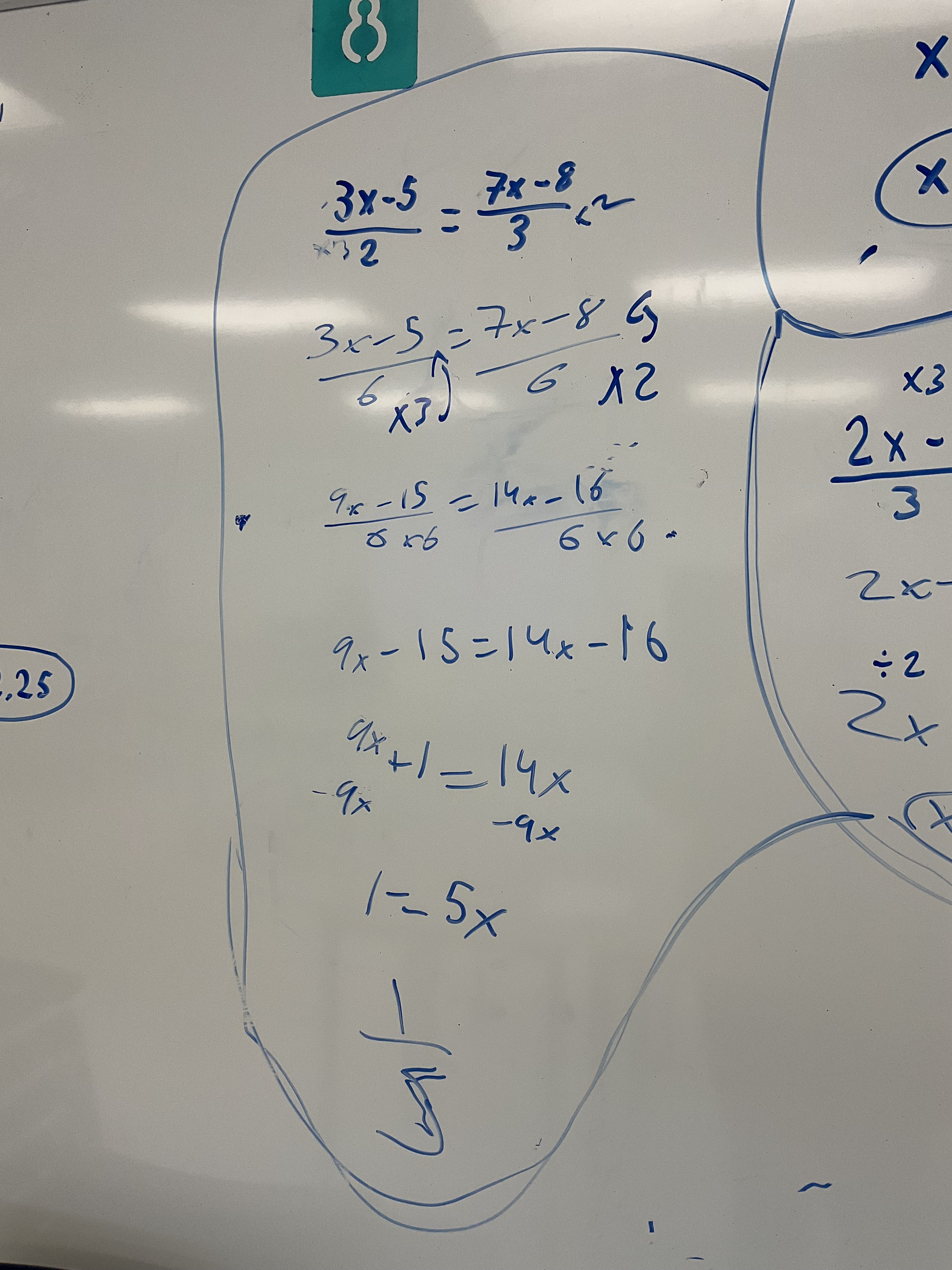Next we looked at questions with fractions on both sides, and variables on both sides. We now needed a new strategy of “make a common denominator” and then we can multiply both sides by that denominator to get rid of it.