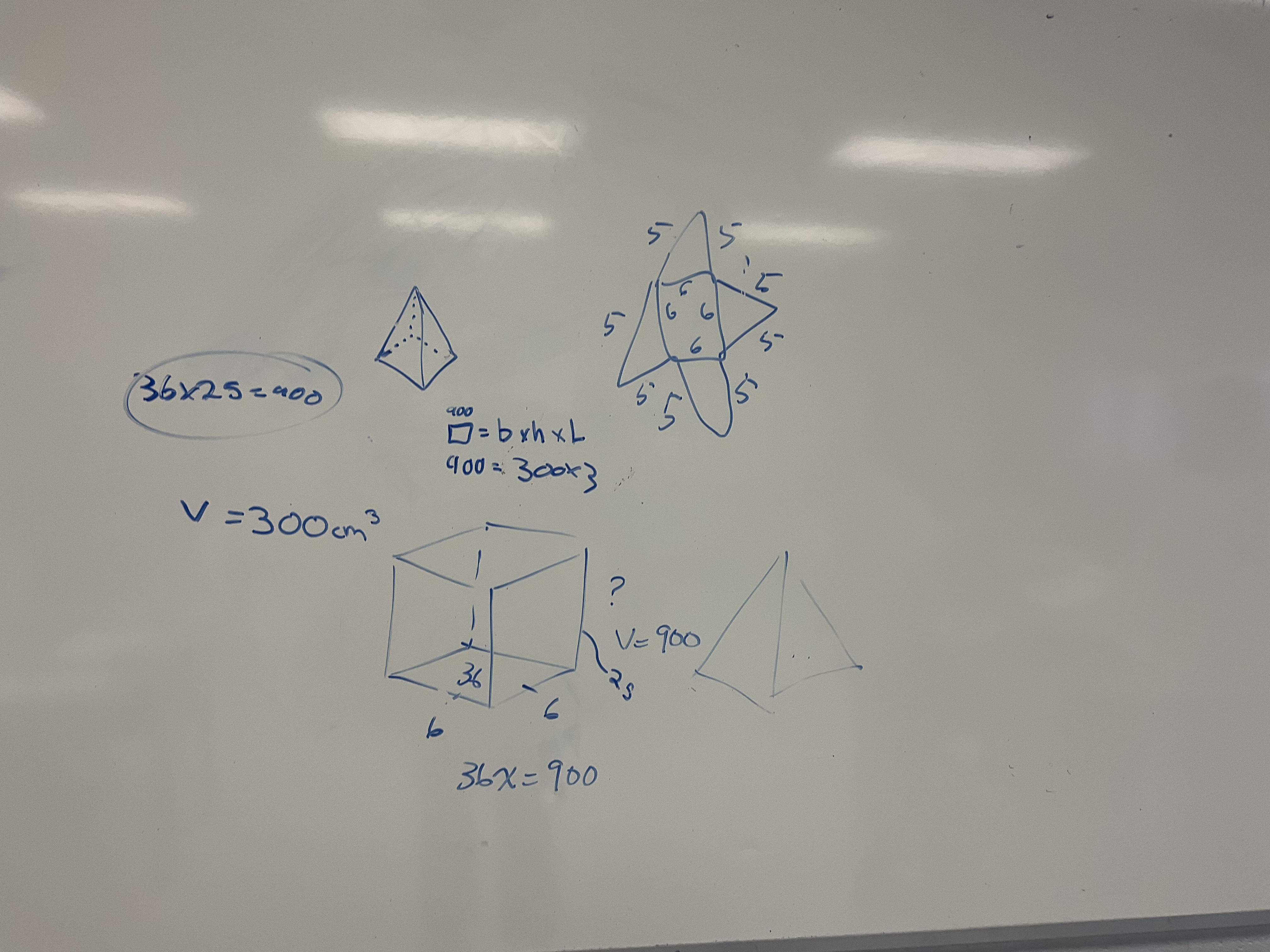 After some productive struggle the connection was made between the water demo and the task. The volume of a prism with same base and height would be 900 cubic centimetres. Many groups drew on the work on the whiteboards for inspiration, and there were lots of pyramids with sides of the base that were 6cm. They knew that (36)(25)=900, and they took the square root of the 36 to get the side lengths of the square. They then decided to take the square root of the 25 to get side lengths of the triangles, which was an interesting misconception that took off around the room.