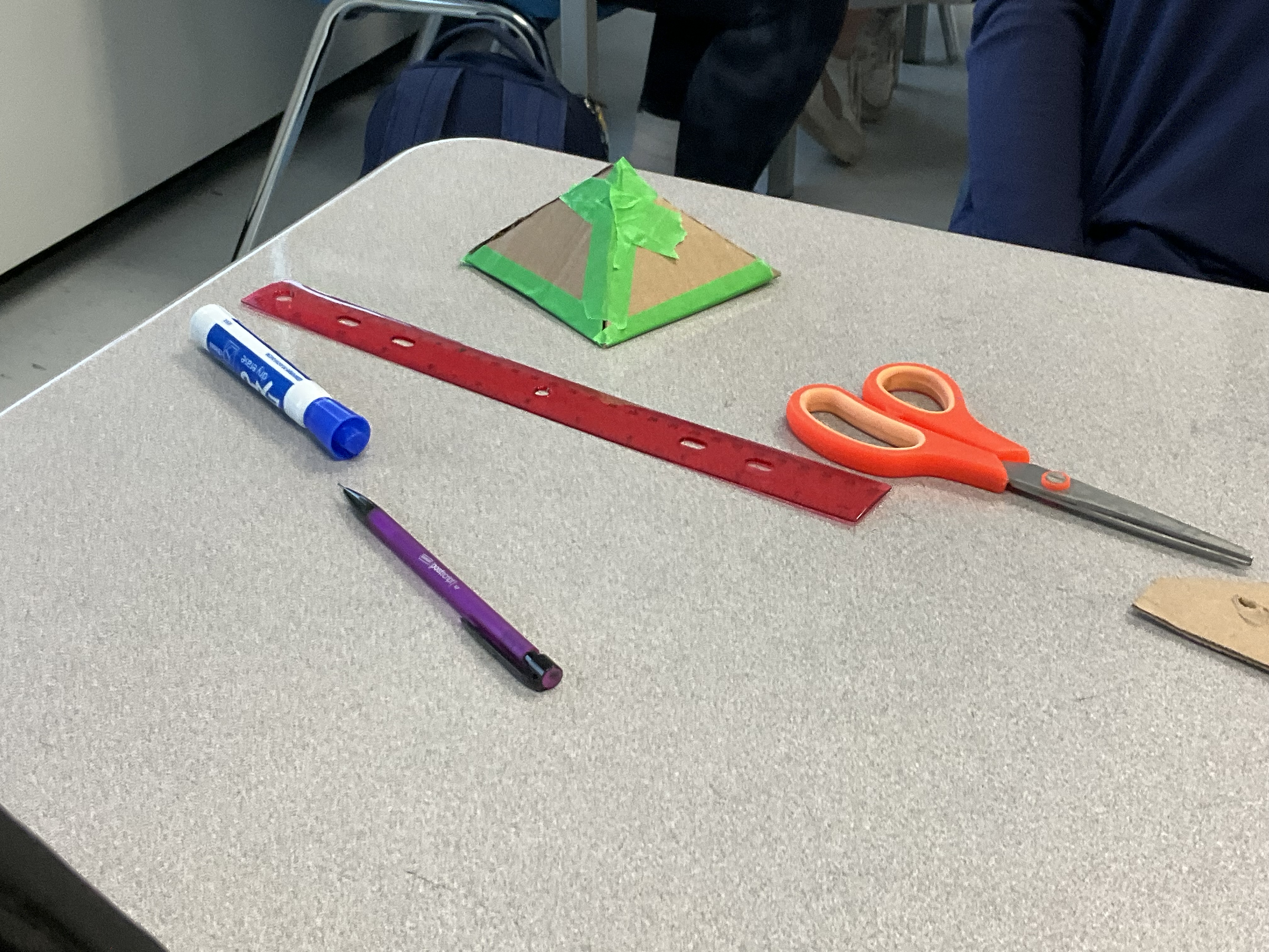 Here’s another that found a new misconception. They made the base of the pyramid 10cm by 10cm and then measured the side of the triangle as 9cm. It was much shorter than they had anticipated, and went back to the drawingboard to make it taller.