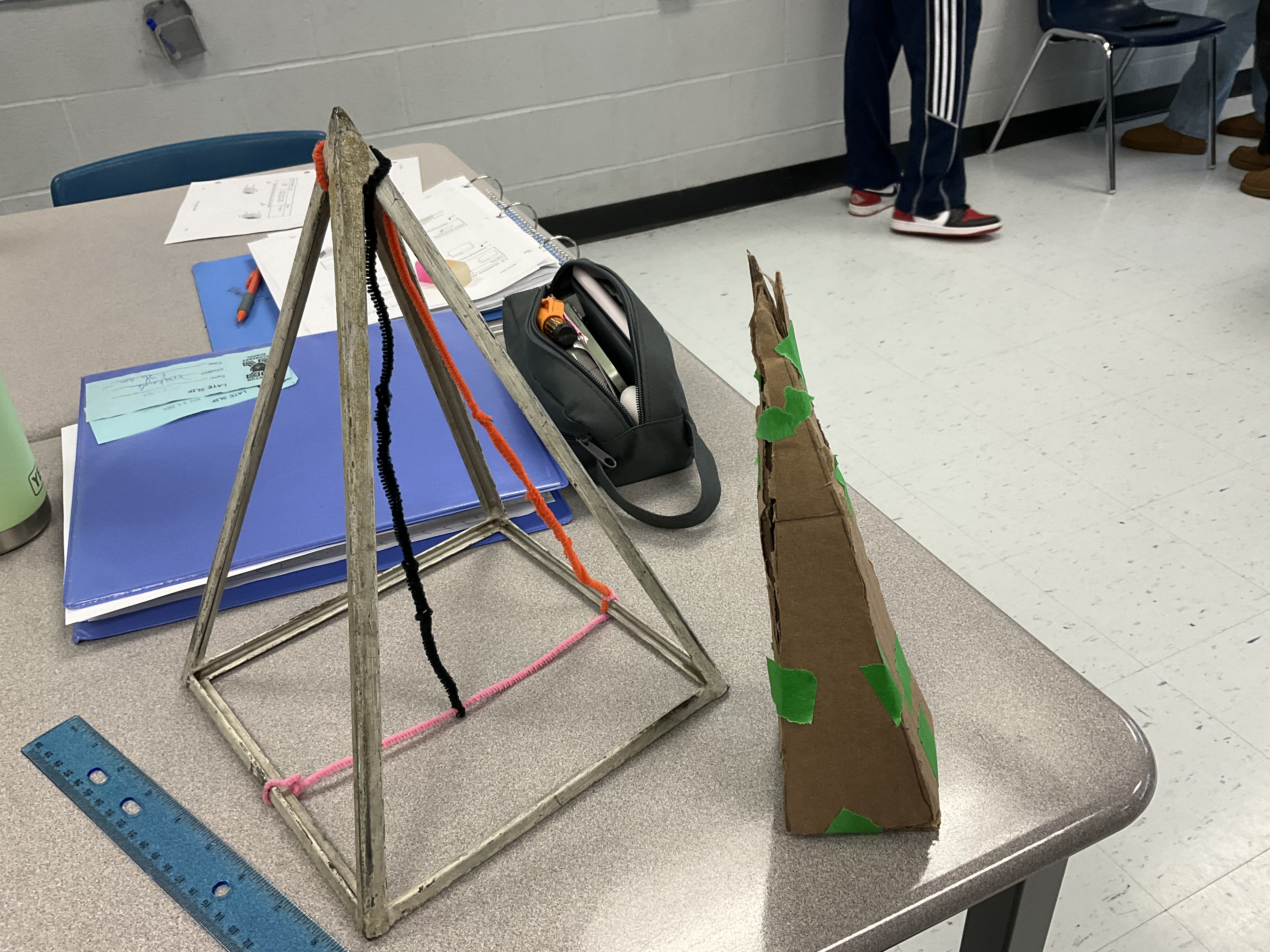 Eventually we had some that were closer. These were just a bit short though! The students measured the desired height of the pyramid as the height of each triangle, which causes the pyramid to be too short. This can be remedied by using the Pythagorean theorem to calculate the slant height of the pyramid, as shown with the pipe cleaners on the wireframe model.