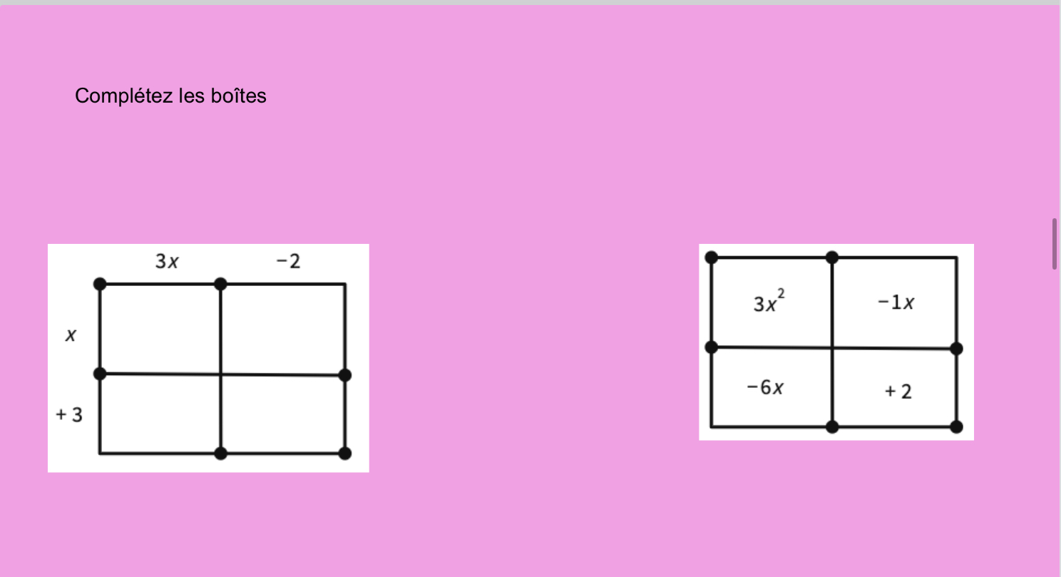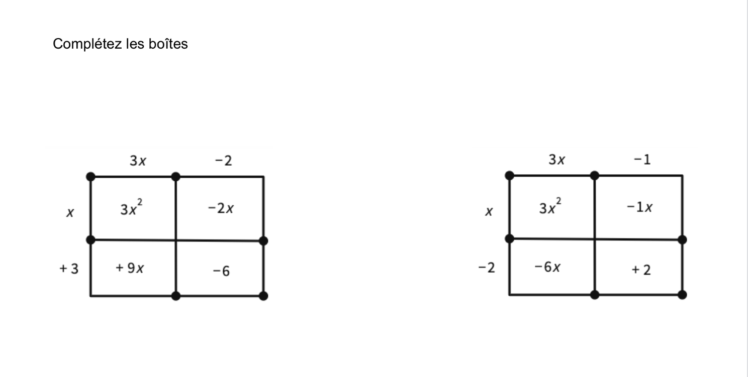 when we fill in the boxes we multiply. When we are looking for the dimensions on the outside of the box we need to common factor. For example, the bottom row has -6x and +2 we can common factor a -2 from both terms. We place the -2 on the outside of the box, and then can fill in the dimensions at the top of the box, 3x and -1, and then the other dimension missing on the vertical side would be x. The dimensions are in total (3x-1)(x-2). The solutions are below.