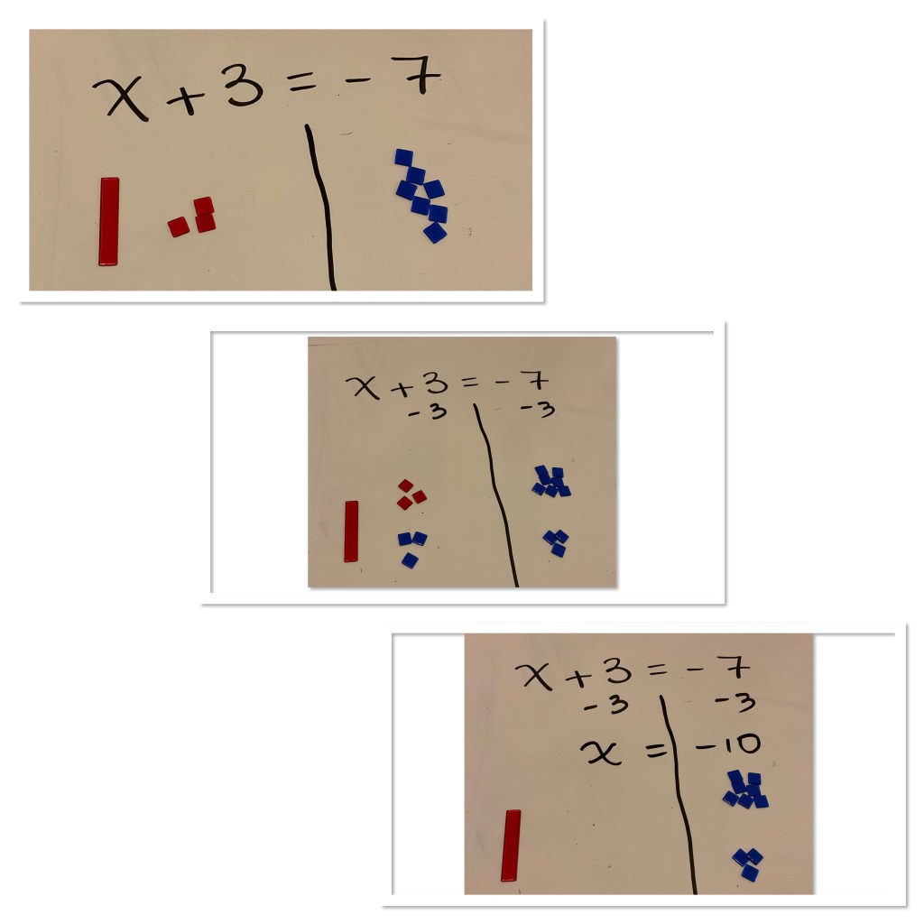 We started with simple equations like x+3=-7 where students could likely solve by inspection, but we were introducing how to build the expressions with tiles and use the tiles and zero pairs to solve.