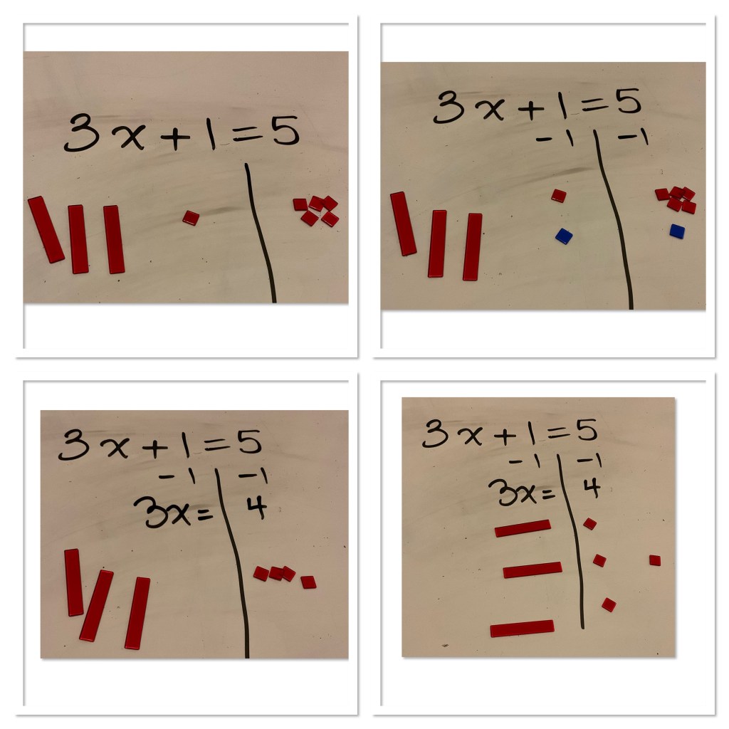 The final step caused some discussion. We can split the x term into 3 groups, but we can’t split the 4 into 3 equal groups without cutting up a tile. Some students showed the answer as x=1 and 1/3, some said the answer is x=4/3 since it’s 4 tiles split into 3 groups. Pretty neat!