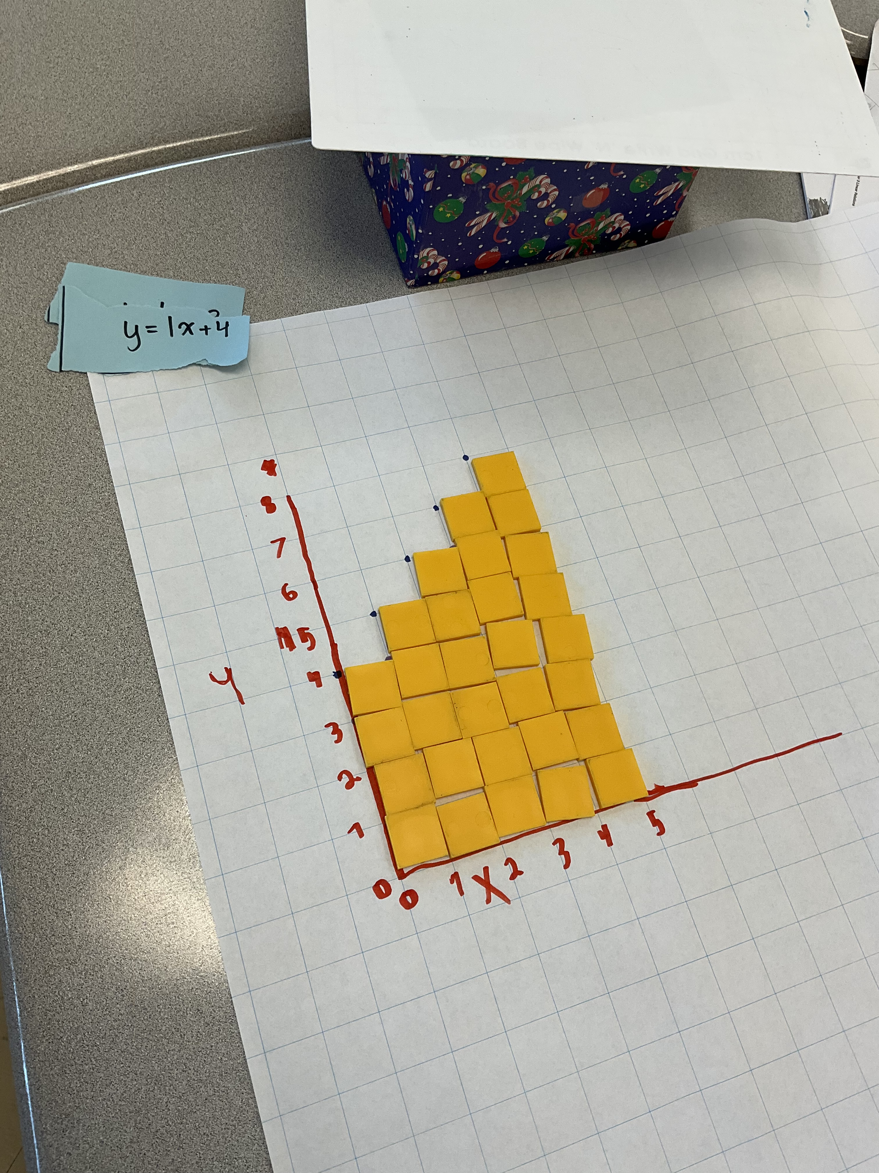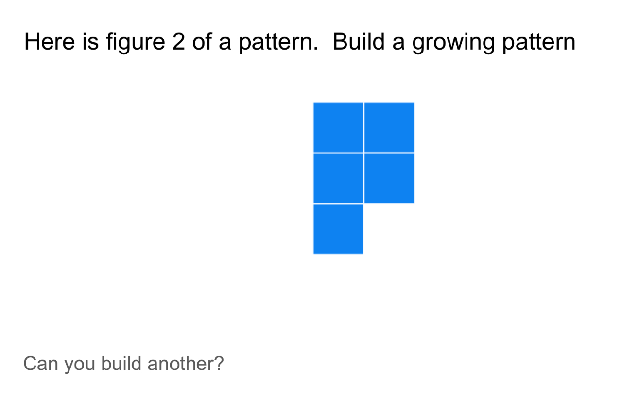 this was a neat pattern that was fun to unpack. We looked at how it grew and noticed that it was not linear because we added different amounts each time. We saw that we could split the figure into a square and 1 extra tile. The constant is 1 since figure 0 is 1. We determined the equation was y=x^2+1.