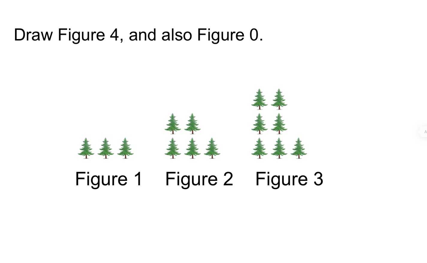 We built and extended the pattern using square tiles. We noticed that we added 2 new tiles each time, and we can see that we always add the new tiles in the same place. We can also see that figure 0 would have 1 tree. Figure 0 is the constant. It’s always there. We thought about how many trees would be in figure 10, or figure 100. We could make a table, and we could add 2 and add 2 and add 2 until we get to figure 100, but that is tedious, so we can think about how many groups of 2 you added. To get to figure 100 we add 2 100 times to the 1 that we started with. To get to figure x, we add 2 x times to the 1 that we started with. The equation, or pattern rule, is y=2x+1