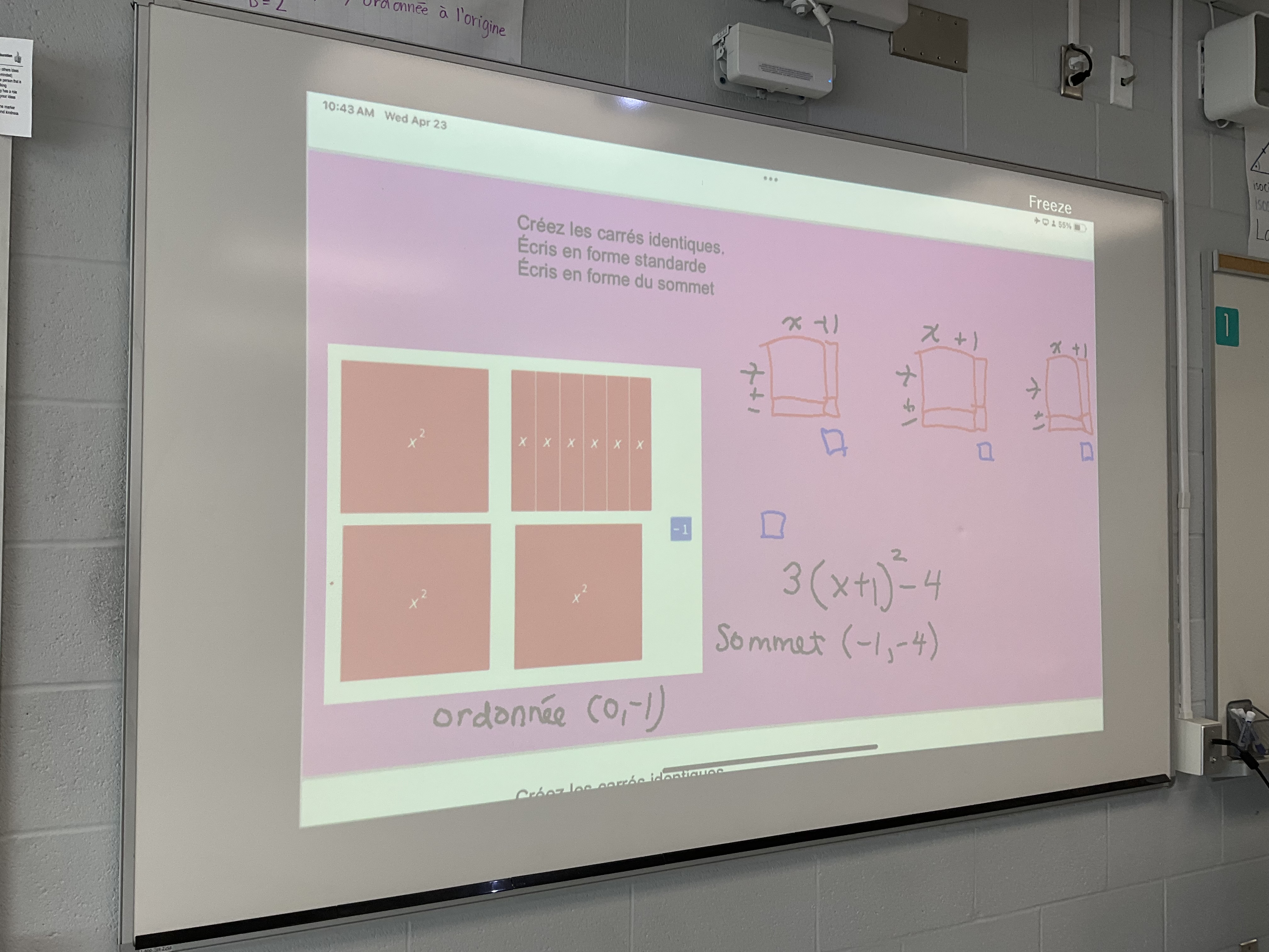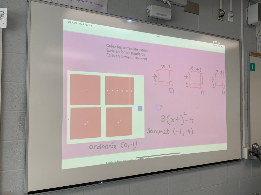 Today was completing the square day in several grade 10 classes. We used algebra tiles to work on understanding how to complete the square to write a quadratic in vertex form.