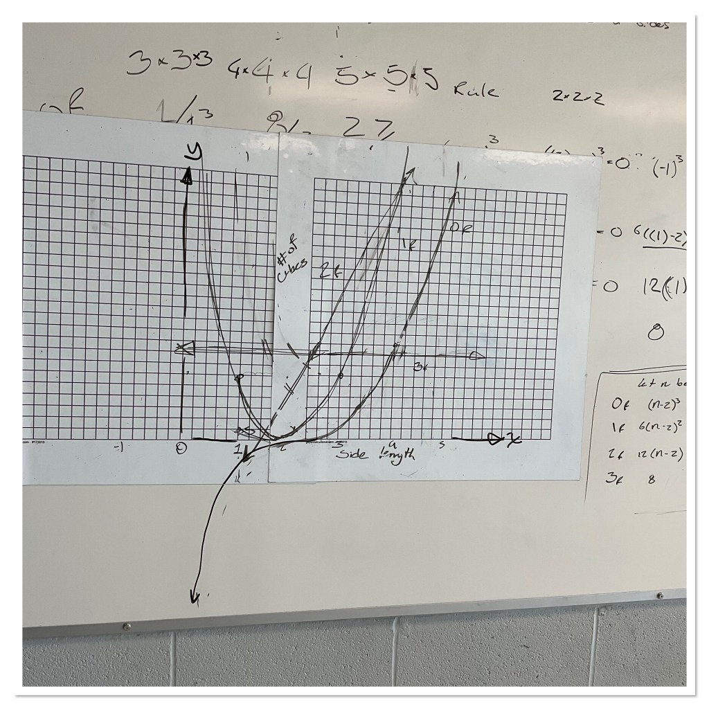 After pushing groups to consider a general formula, we asked them to graph them, and continue their model into the hypothetical range of negative sided cubes. The whole cube scenario falls apart, but the models keep going.