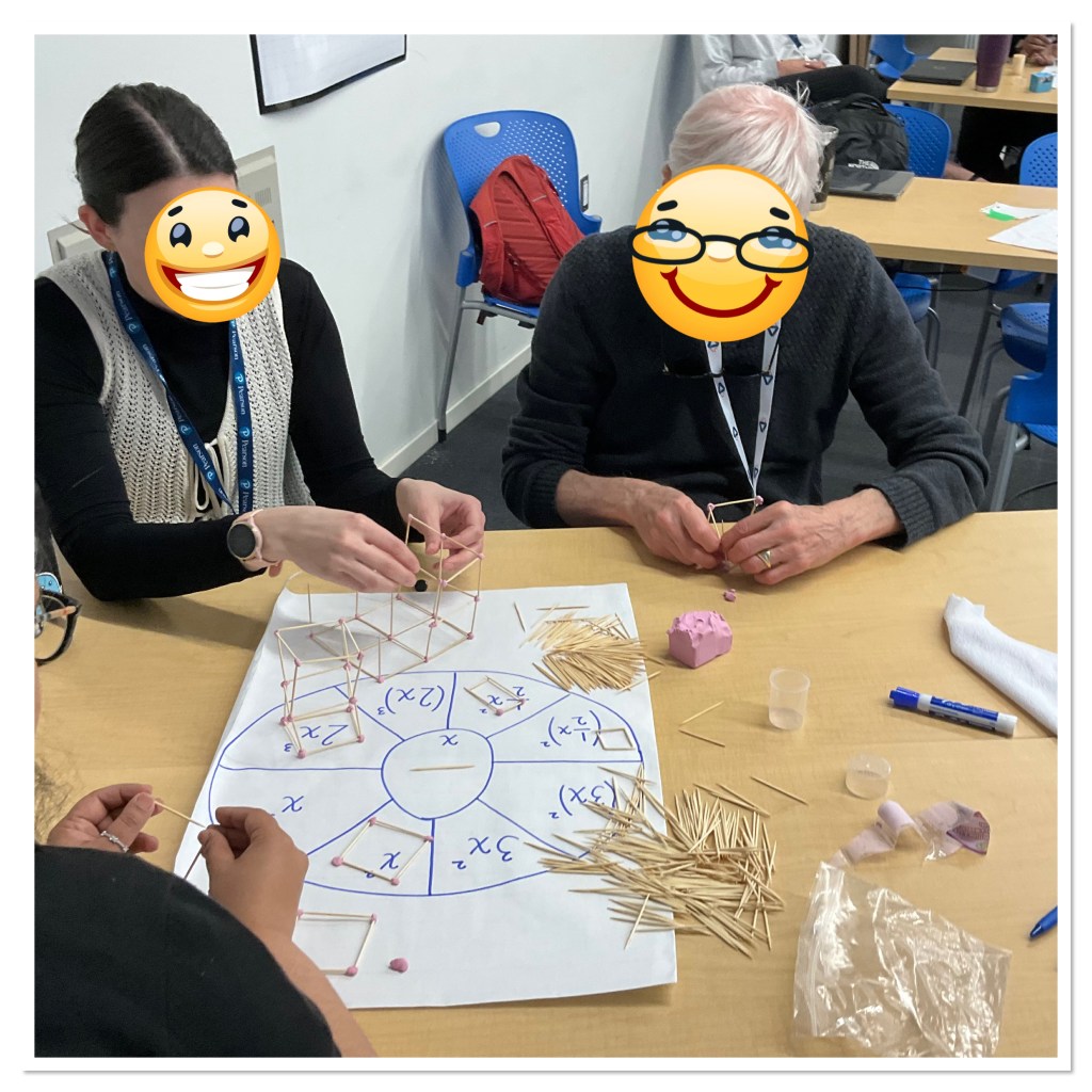 There were lots of great conversations among the groups about what the exponents of 2 and 3 mean physically, and what the brackets mean, in relation to changing the side length of the object, and how that can change the surface area or volume.