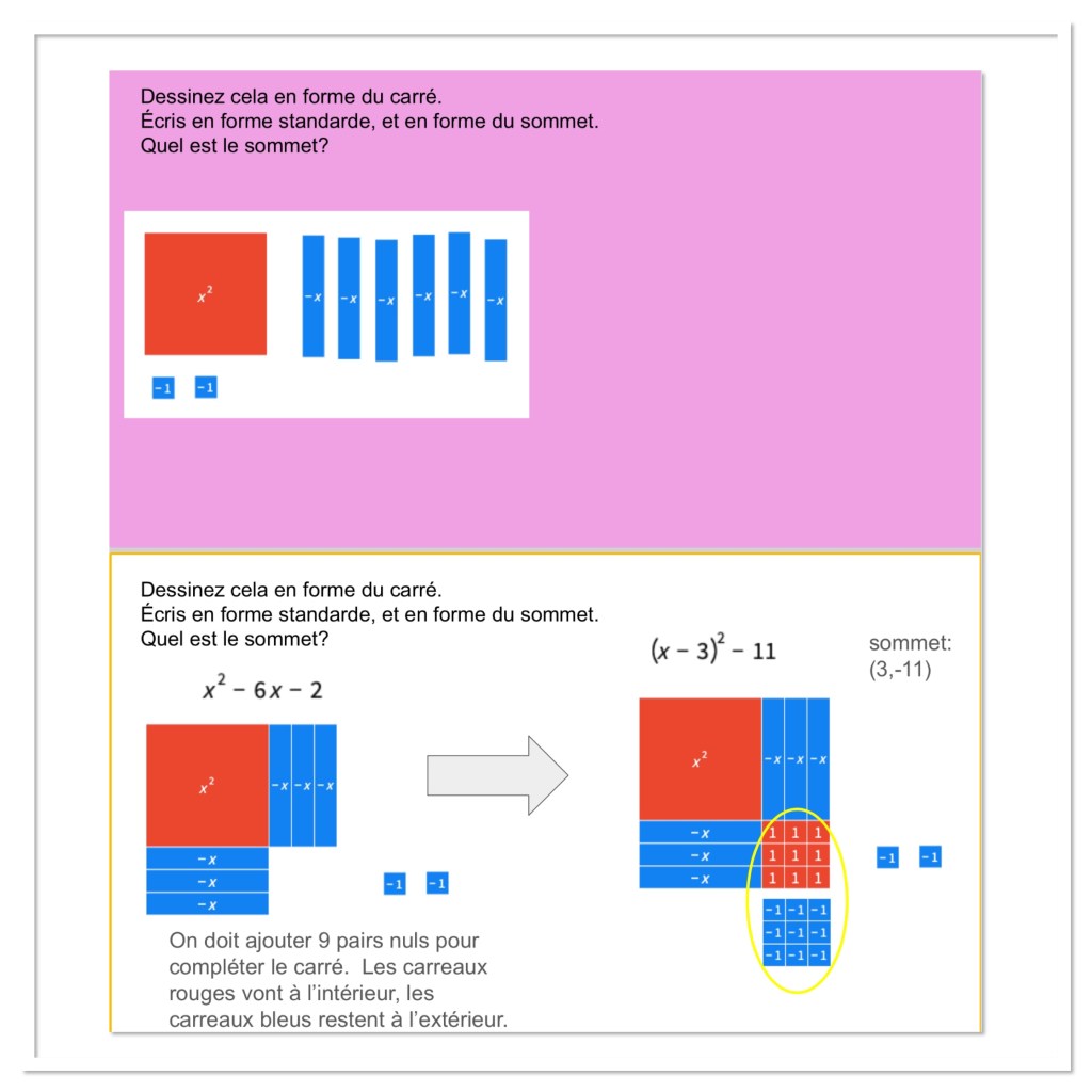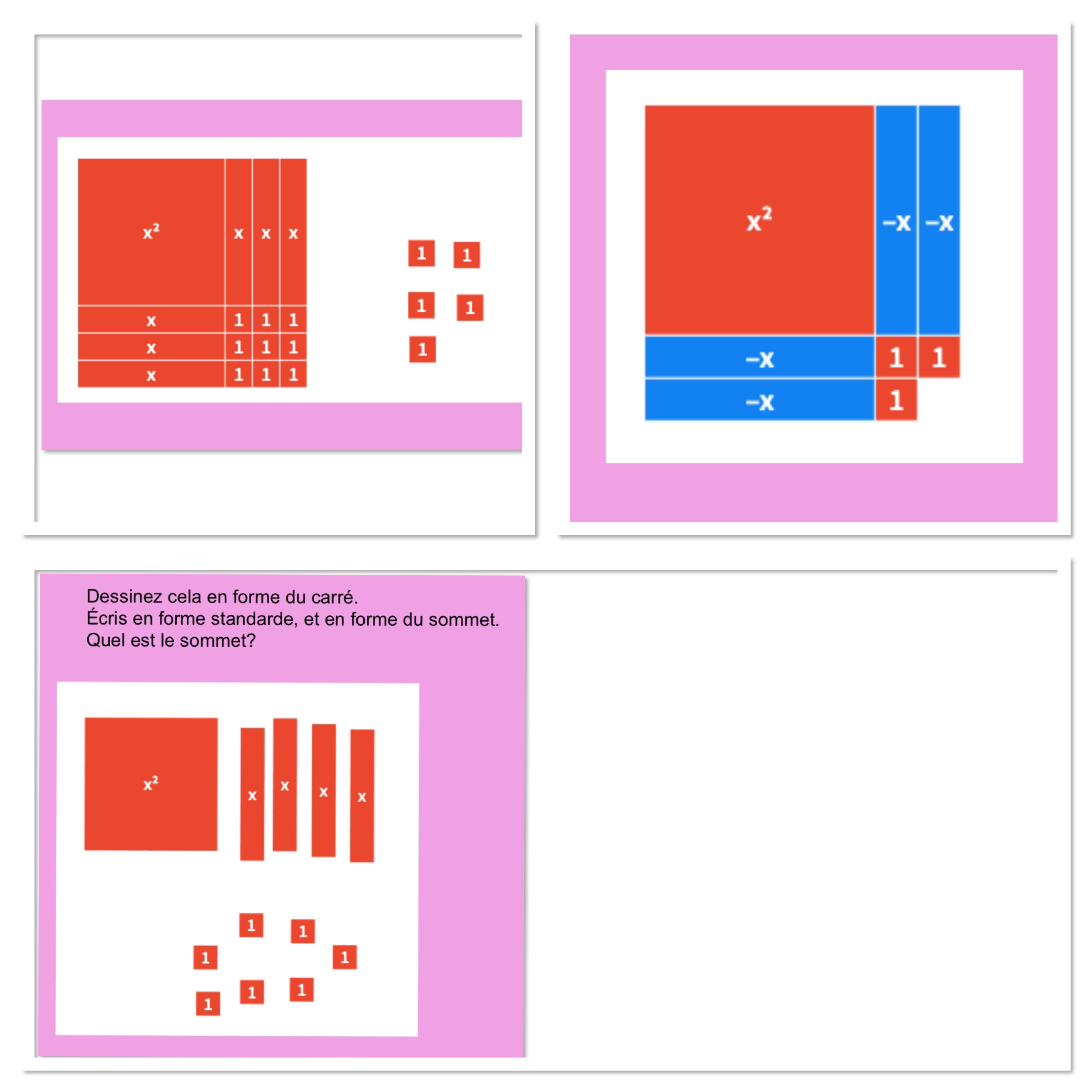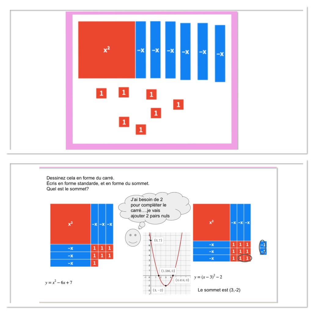 For the last 2 days I’ve been working with a grade 10 class on completing the square. We’ve used algebra tiles and visual representations to make sense of the algebra that is required, and we’ve made connections between vertex form and graphs of parabolas.