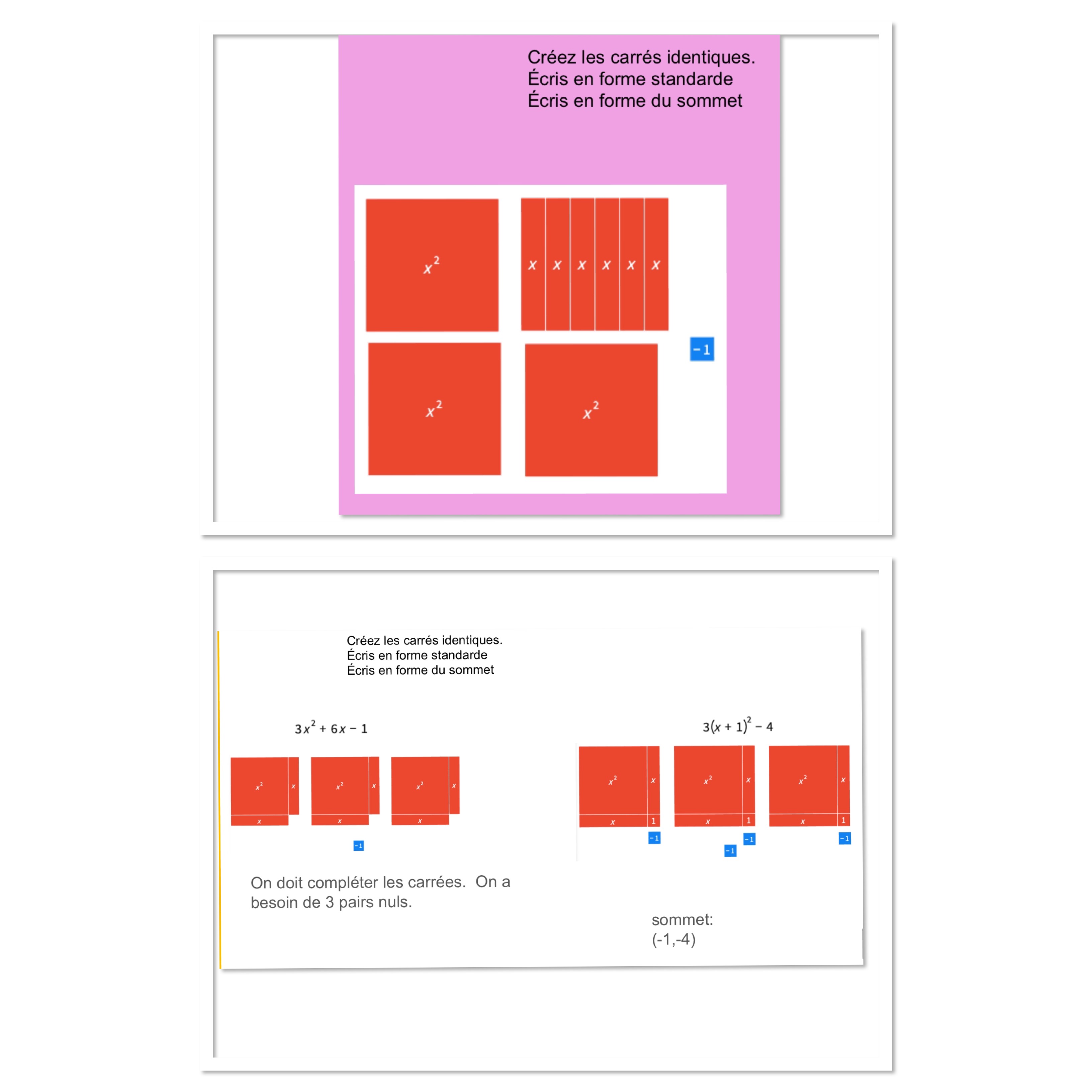 Here we complete the squareS. This was my big algebra tile breakthrough, when I understood how to complete the square with a leading coefficient. We need to create identical squares. We do the same steps. It’s beautiful!