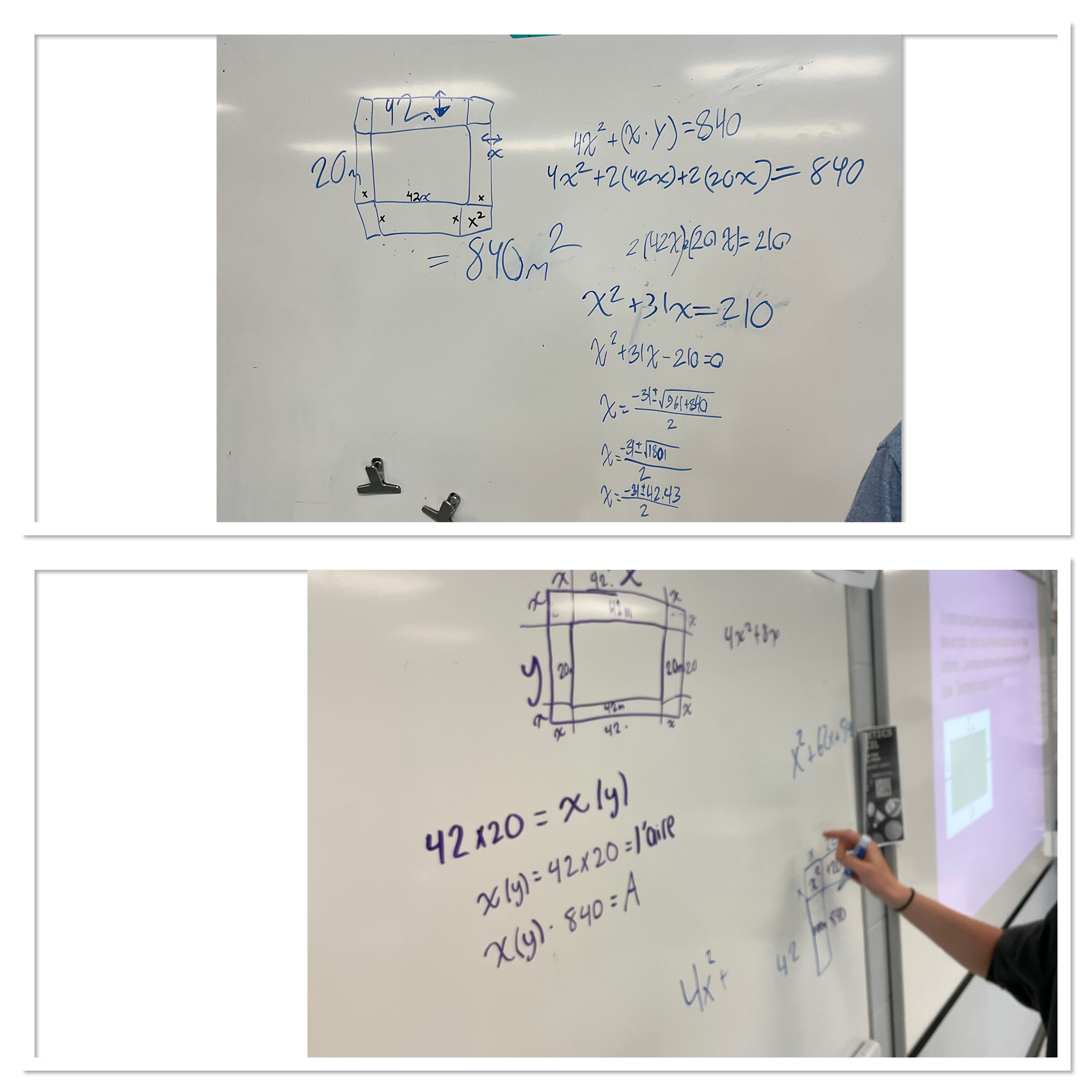 This group landed on an approach where they found outside dimensions of (42+2x) and (20+2x). They knew they needed to subtract the garden area, and then that equals the same as the garden area. Once we get to a trinomial=0 we can sig the quadratic formula and solve.