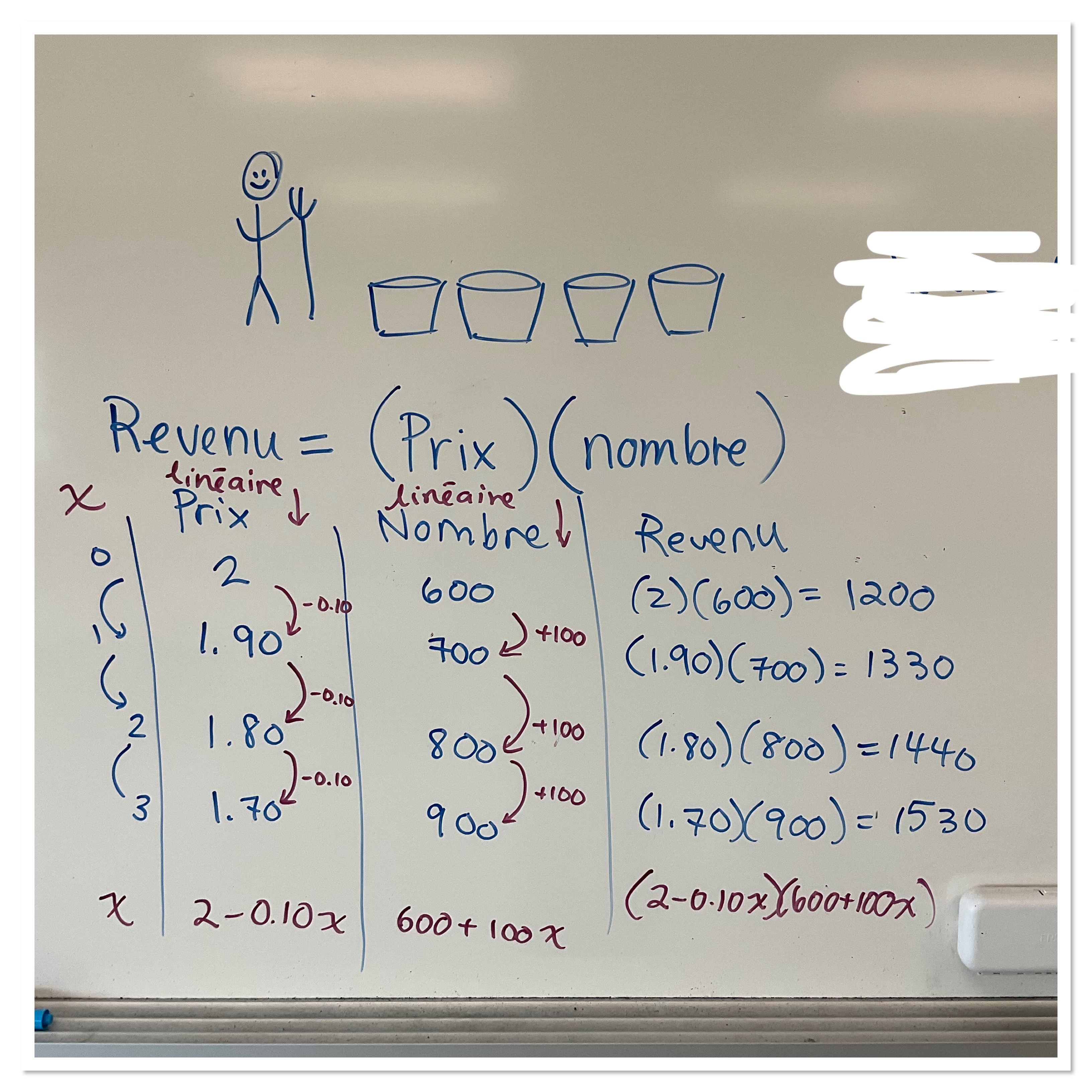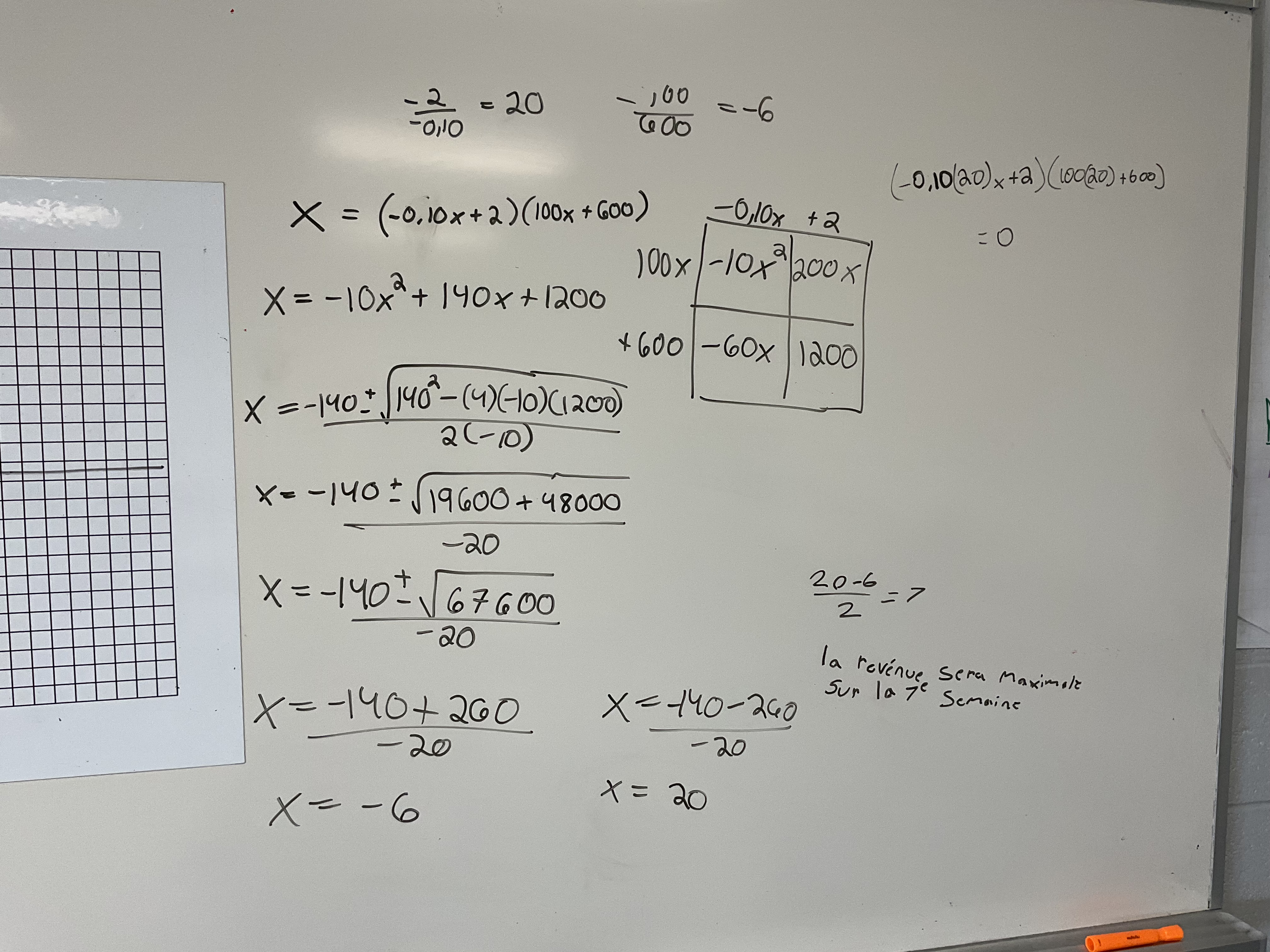 Once we modelled the situation with an equation we split into groups to try to solve for the number of weeks x to wait to have a maximum revenue.