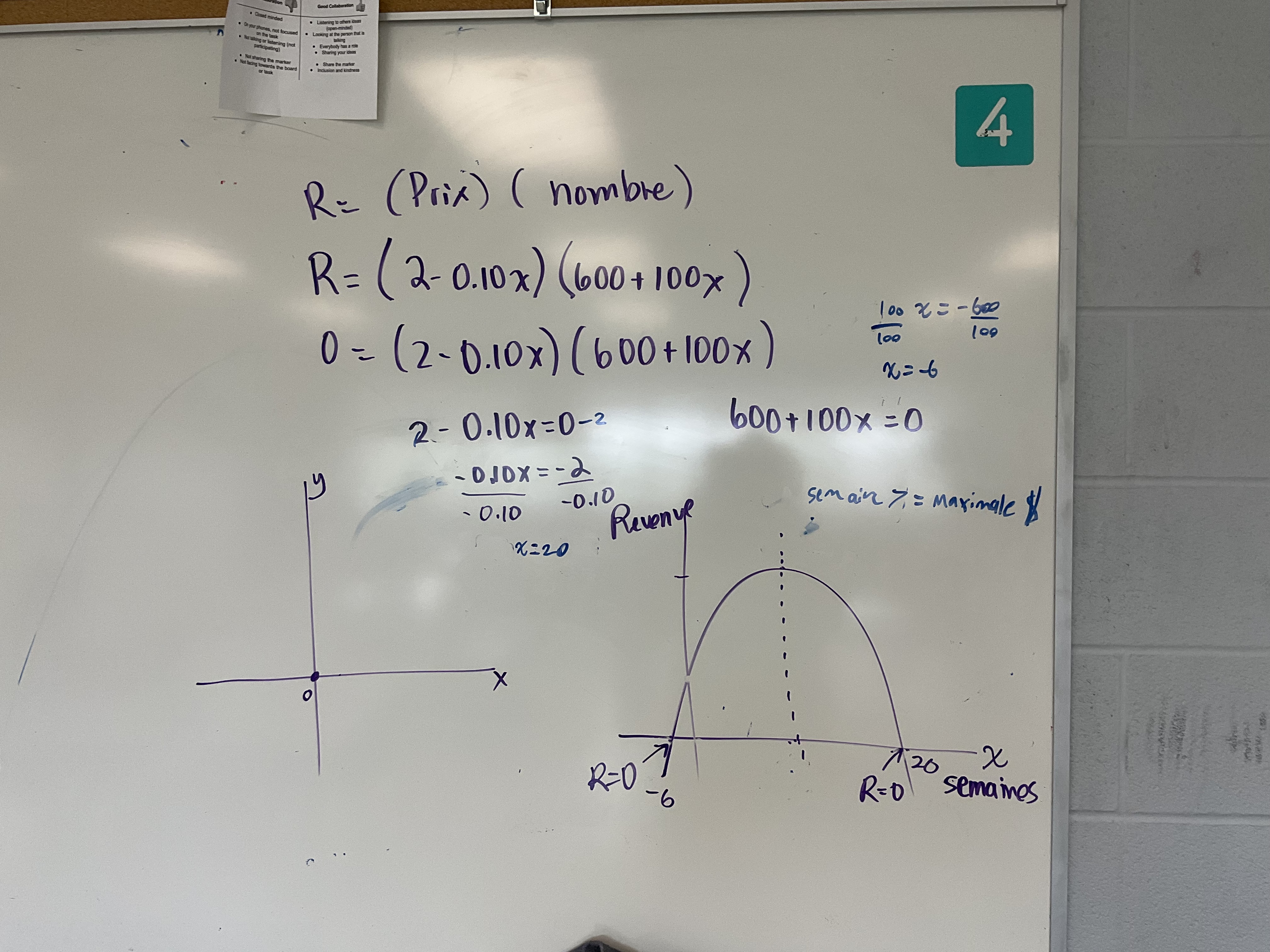 Once we noticed (by looking around the room) that some groups concluded that the farmer should wait 20 weeks and others got a different, smaller, answer I prompted them to substitute in their weeks number for x and to calculate the revenue. When groups noticed that when they subbed in 20 the revenue was zero, they realized they needed to rethink some things.