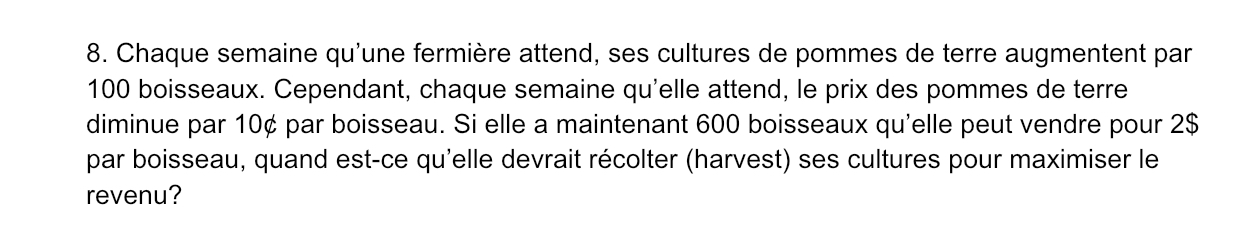 It’s a question about when a farmer should harvest her potato crops to maximize revenue. There are initially 100 bushels that can be sold for $2/bushel. For each week she waits the price per bushel drops by $0.10, and the number of bushels grows by 100.