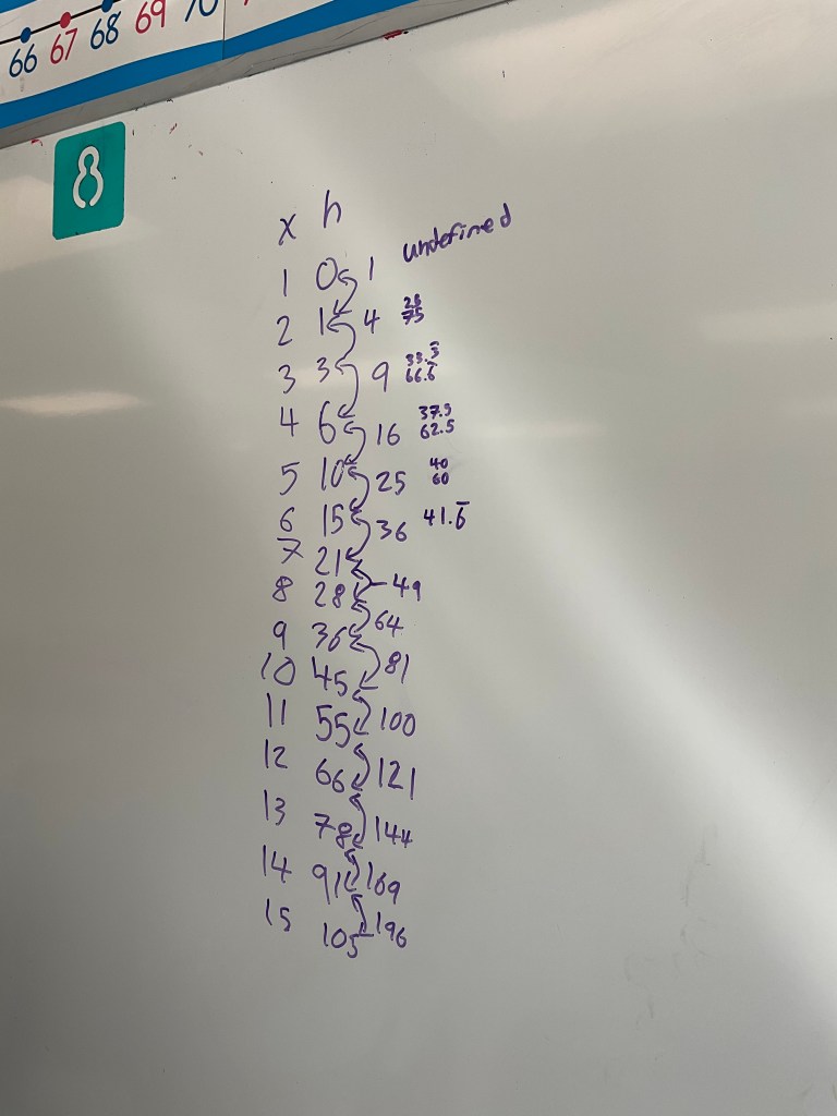 Another group modelled what would happen with a small group. We know that with 1 person there are no high fives, and with 2 people there is 1, and with 3 people there are 3, and with 4 there are 6. We kept adding more people to the group and they did the high fives and counted. Eventually a pattern was noticed, and identified as quadratic since the 2nd differences are all 1.