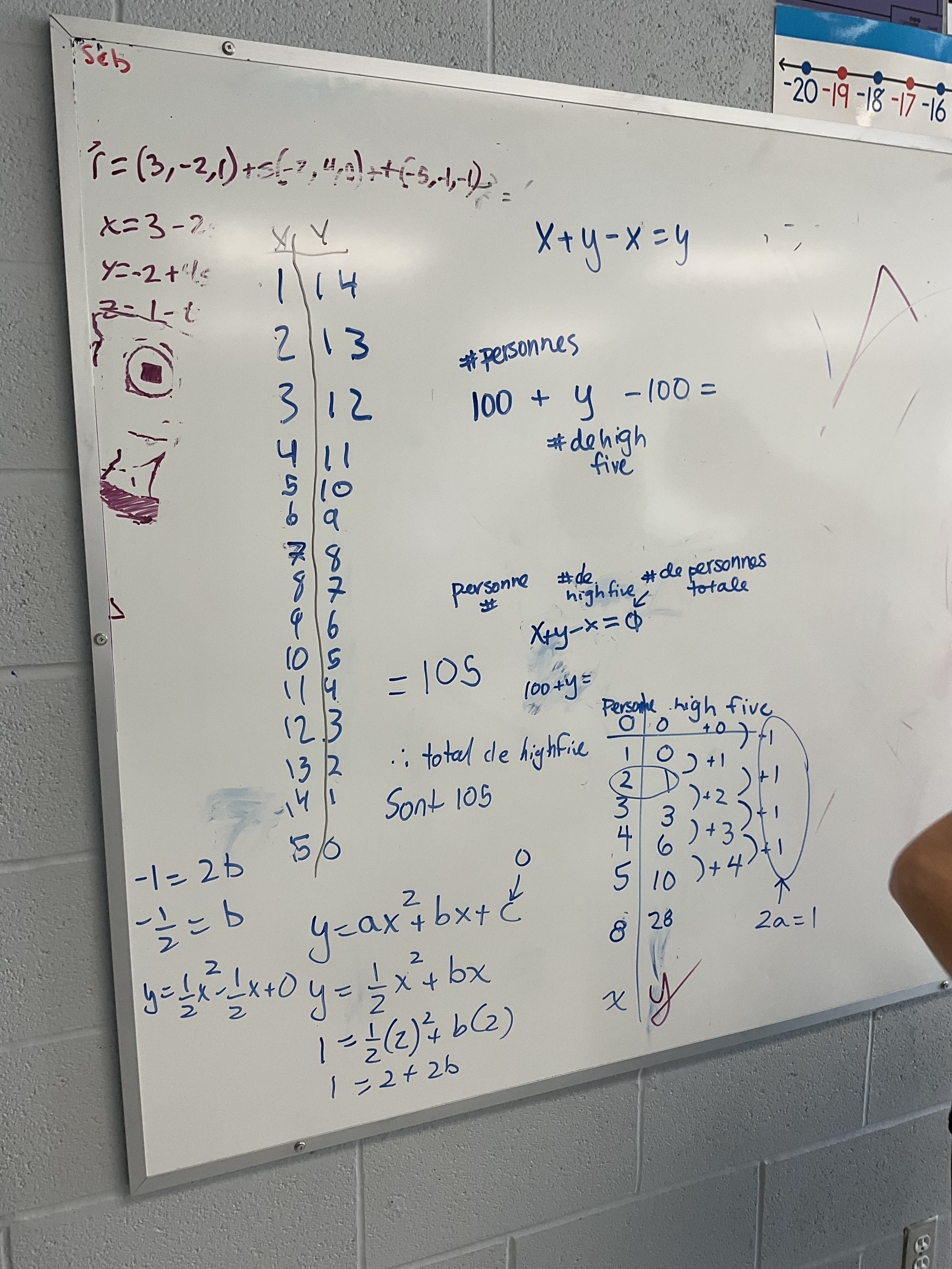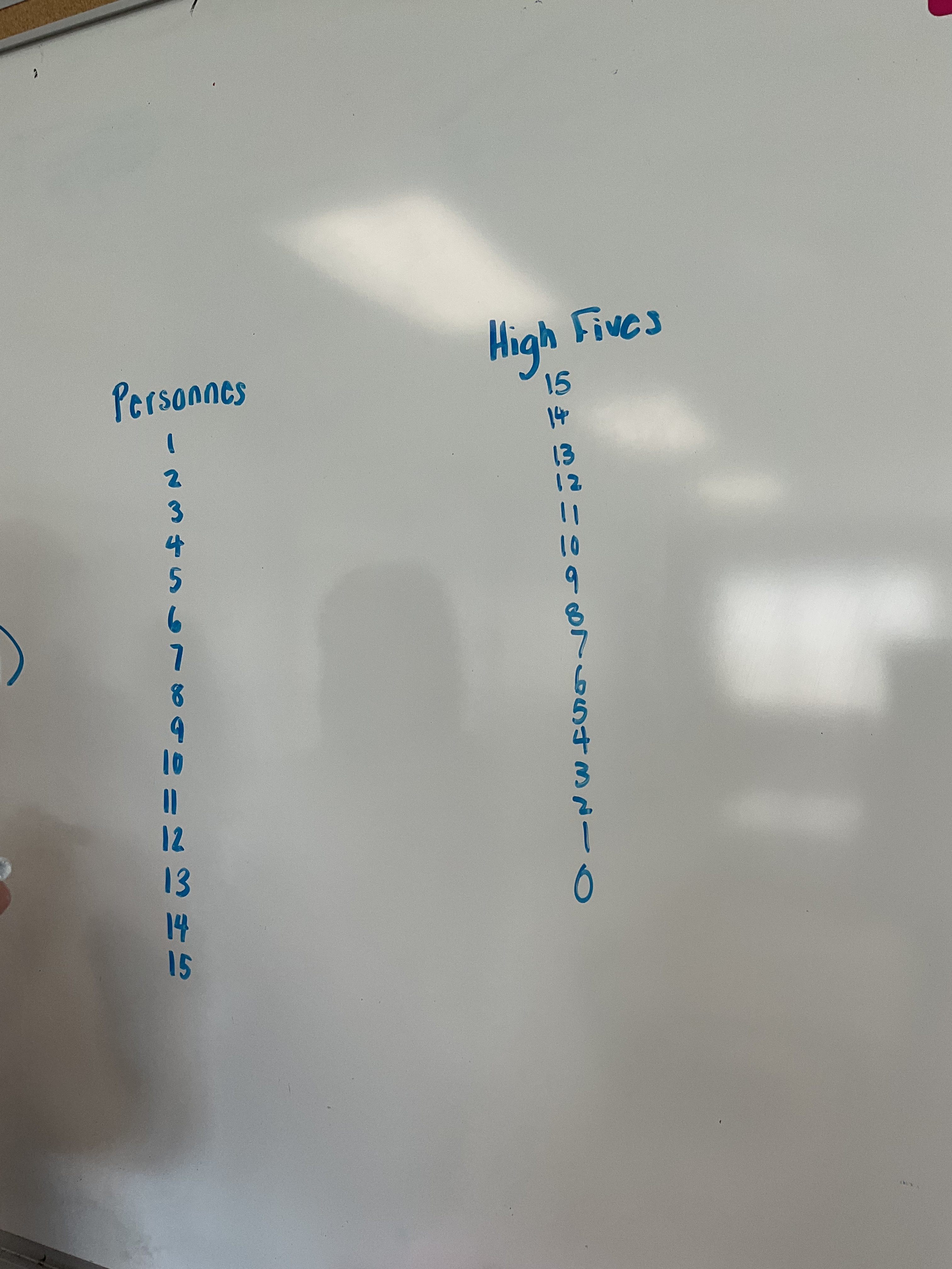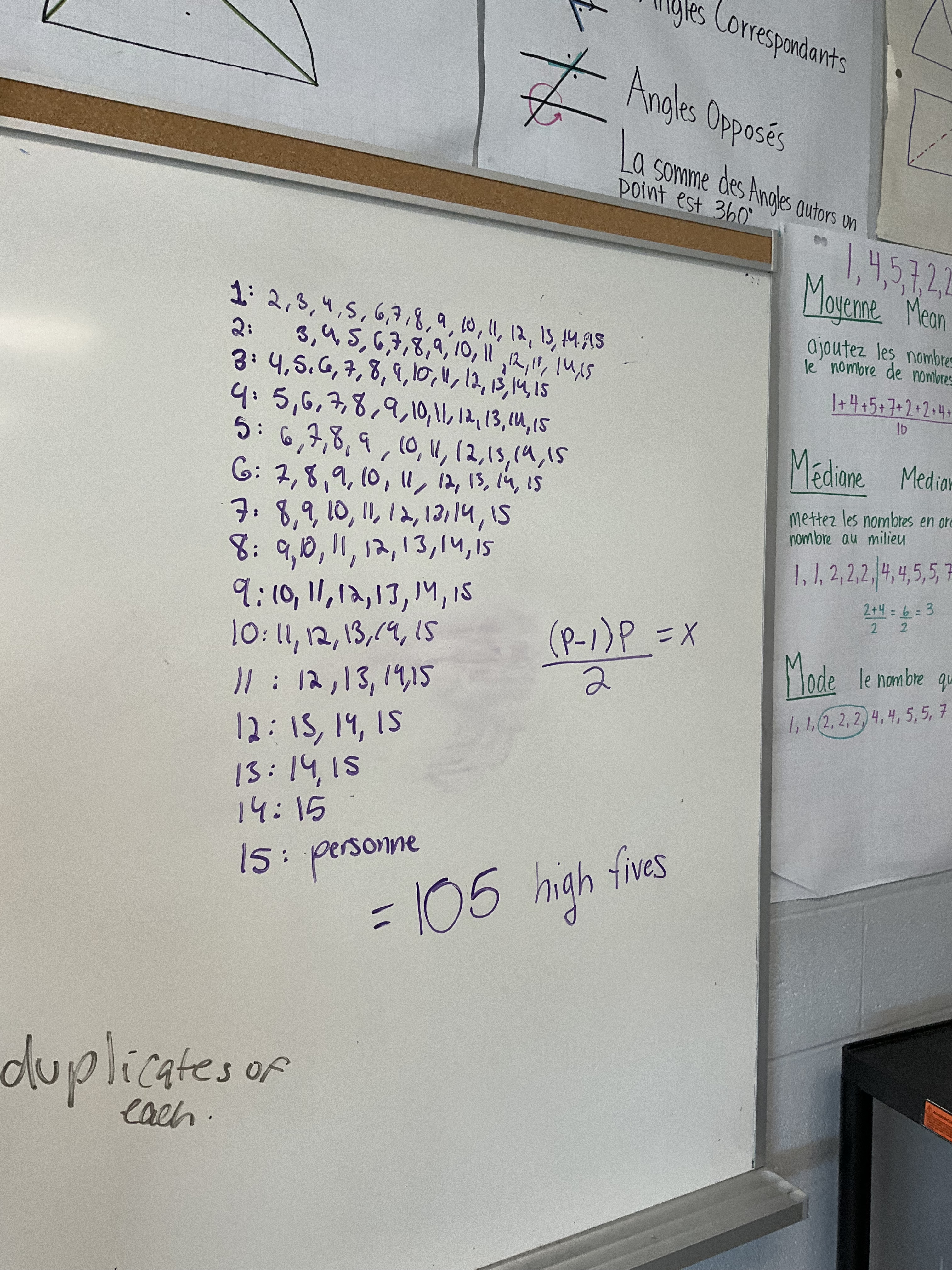 Today in grade 10 we explored how many unique high fives there were in the room. We defined a high five as unique when person A high fives with person B. If Person B then high fives person A it doesn’t count.