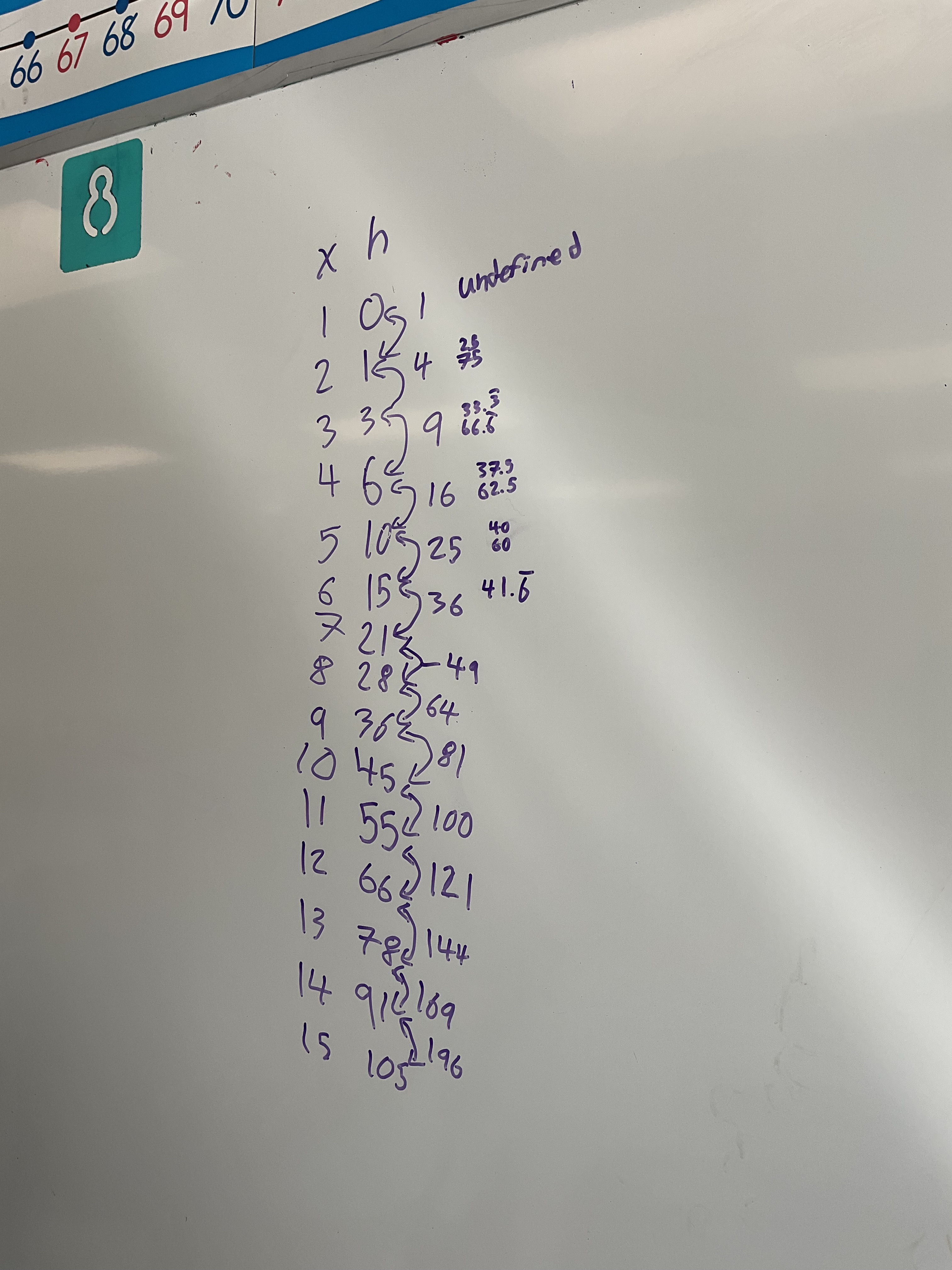Another group modelled what would happen with a small group. We know that with 1 person there are no high fives, and with 2 people there is 1, and with 3 people there are 3, and with 4 there are 6. We kept adding more people to the group and they did the high fives and counted. Eventually a pattern was noticed, and identified as quadratic since the 2nd differences are all 1.