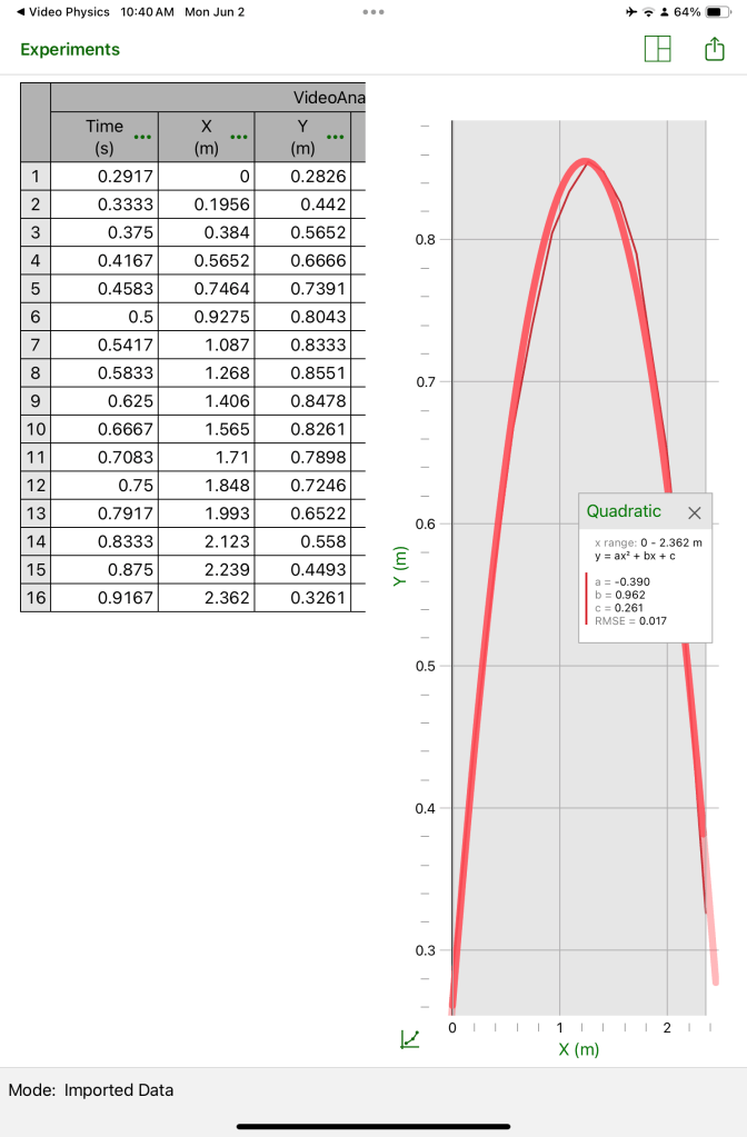Finally we upload the file to a different app where some analysis can be done. In this case we can see a table of values, and a graph with a smoothed quadratic overlayed. The a b c values are given for the quadratic.