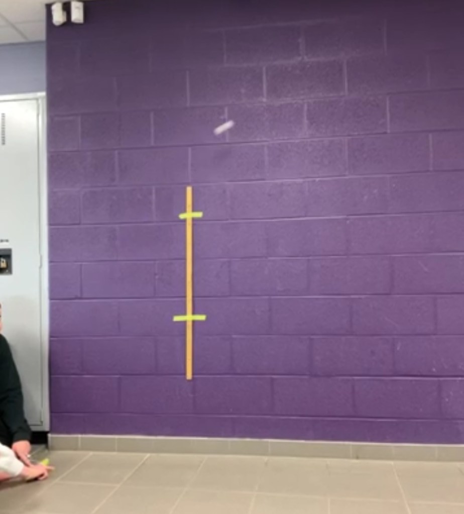 Here’s a different one being tracked. We need to scale the image (that’s why there’s a meter stick on the wall). We need to touch the screen where we see the pompom (we track the leading edge of the blur). The program advances time slowly so we can see the pompom at many points along its trajectory.