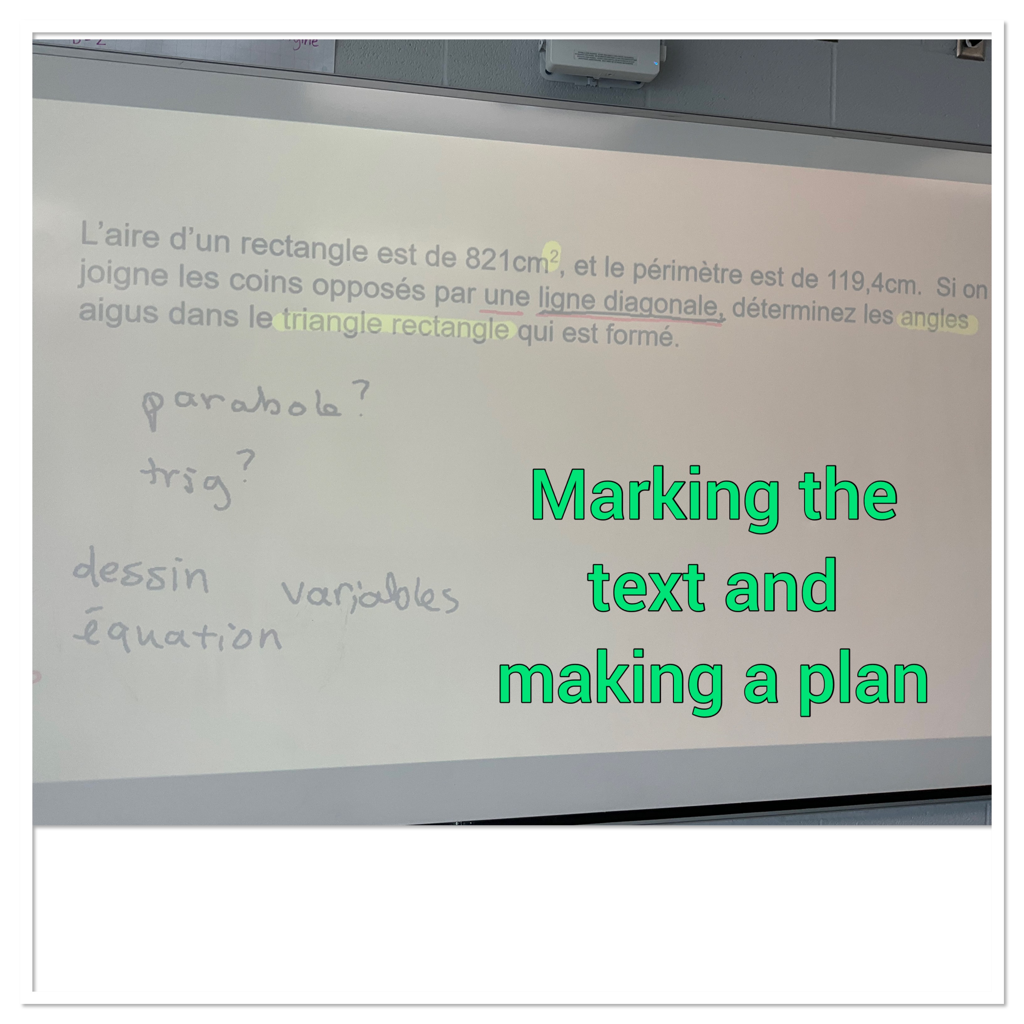 We needed to do a bit of brainstorming with our groups. What type of question is this? We noticed key words, and units. The word angle made us think of trigonometry. The squared units made us think of area and quadratics. The 2 equations for perimeter and area made us think of substitution. We know we need to make a diagonal line, and we know diagonals join opposite corners. We need a good picture and some variables and some equations!