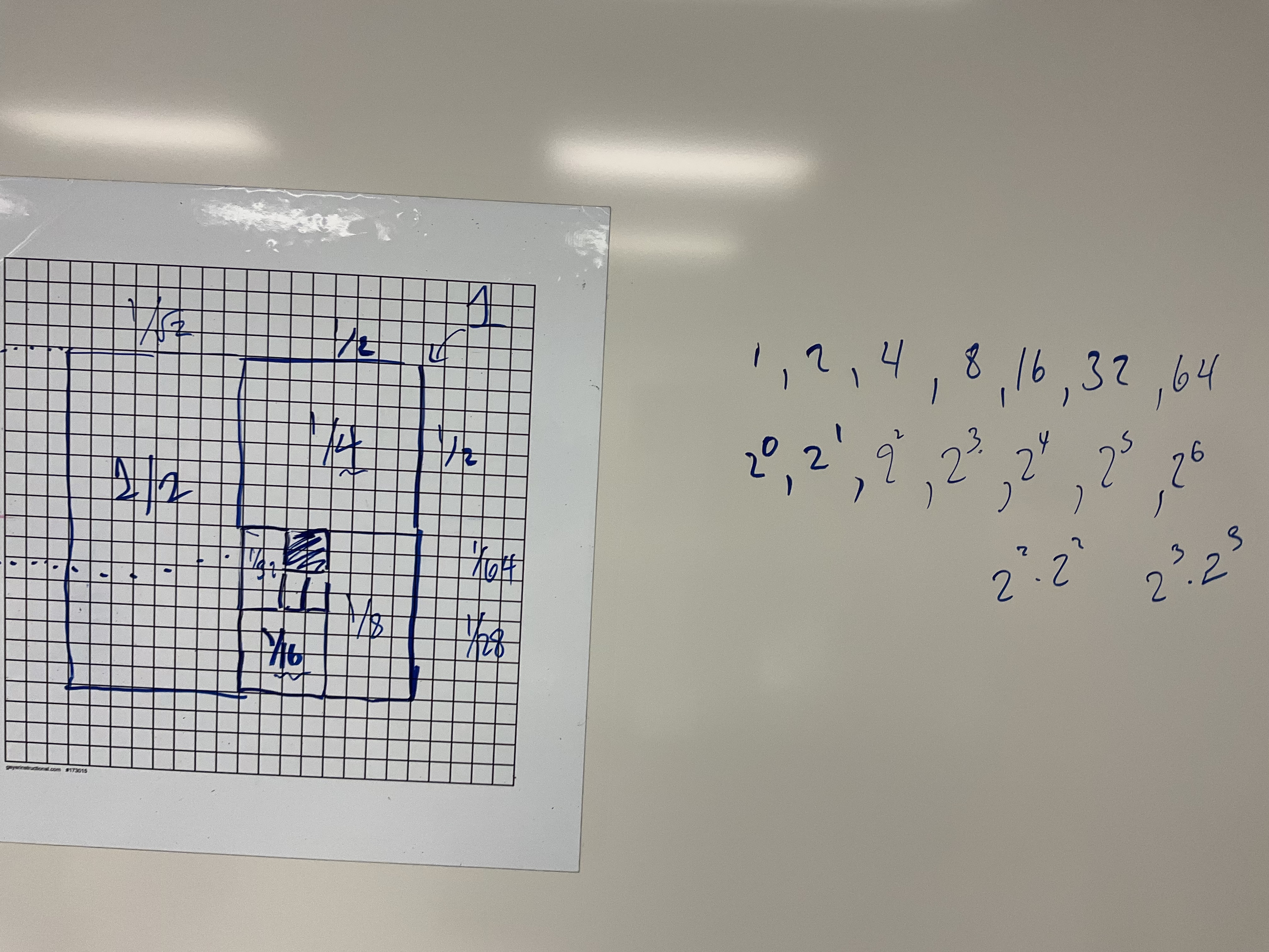 This image was a springboard for a lot of discussion. People talked about how they could see rectangles and squares, and how there was a pattern that the regions were divided in half each time. Groups took different directions, some looking at the fibonacci numbers and golden ratio and spiral, others looked at how the fractions had denominators that were all 2 to the power of something. Another group made a connection to binary numbers being base 2, and another explored the sum of the fractions will all add up to 1 whole square. Several groups were upset that the drawing was incomplete and knew that the middle rectangle needed more subdividing…but where to stop?