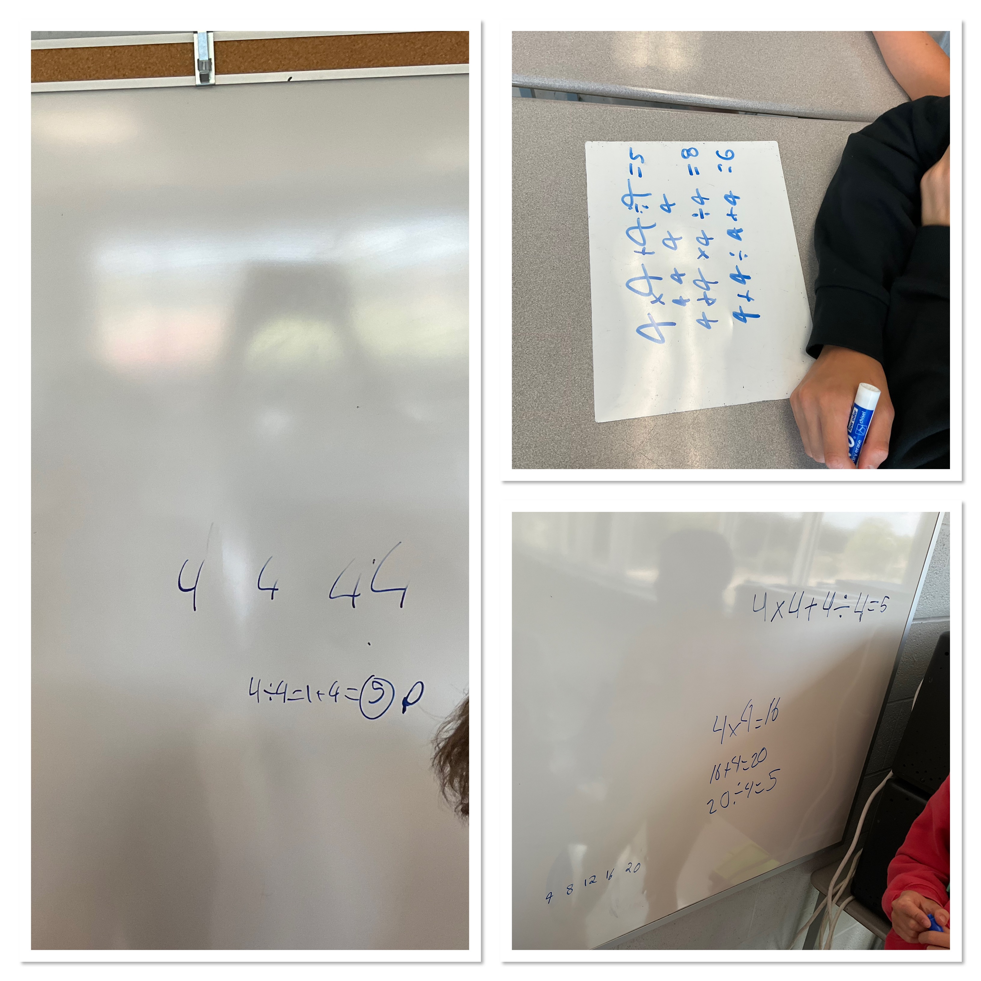 Glad I have some problems in my back pocket. We looked at the 4 4s problem, figuring out how to use 4 4s, and the operations we know (including any exponent), and making expressions that equal 1,2,3,4,5,6,7,8,9,10