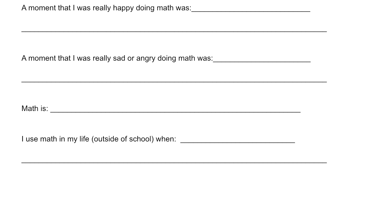 I can get an idea of graphing skills and also see how a student’s math journey has gone. It’s a spring board for future conversations. It’s followed by some questions about their math experiences and how to help them do their best.