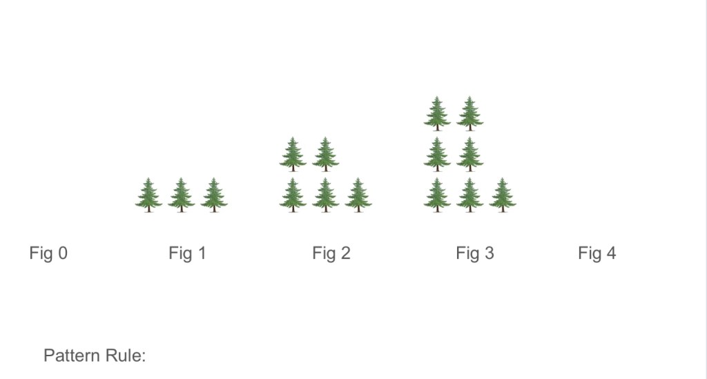 We determined that this pattern grows by 2 each time, and it starts at 1 for figure 0. We used this information to figure out how many trees are in figure 10, figure 100 and figure 1000. We’re going to do more patterning tomorrow.