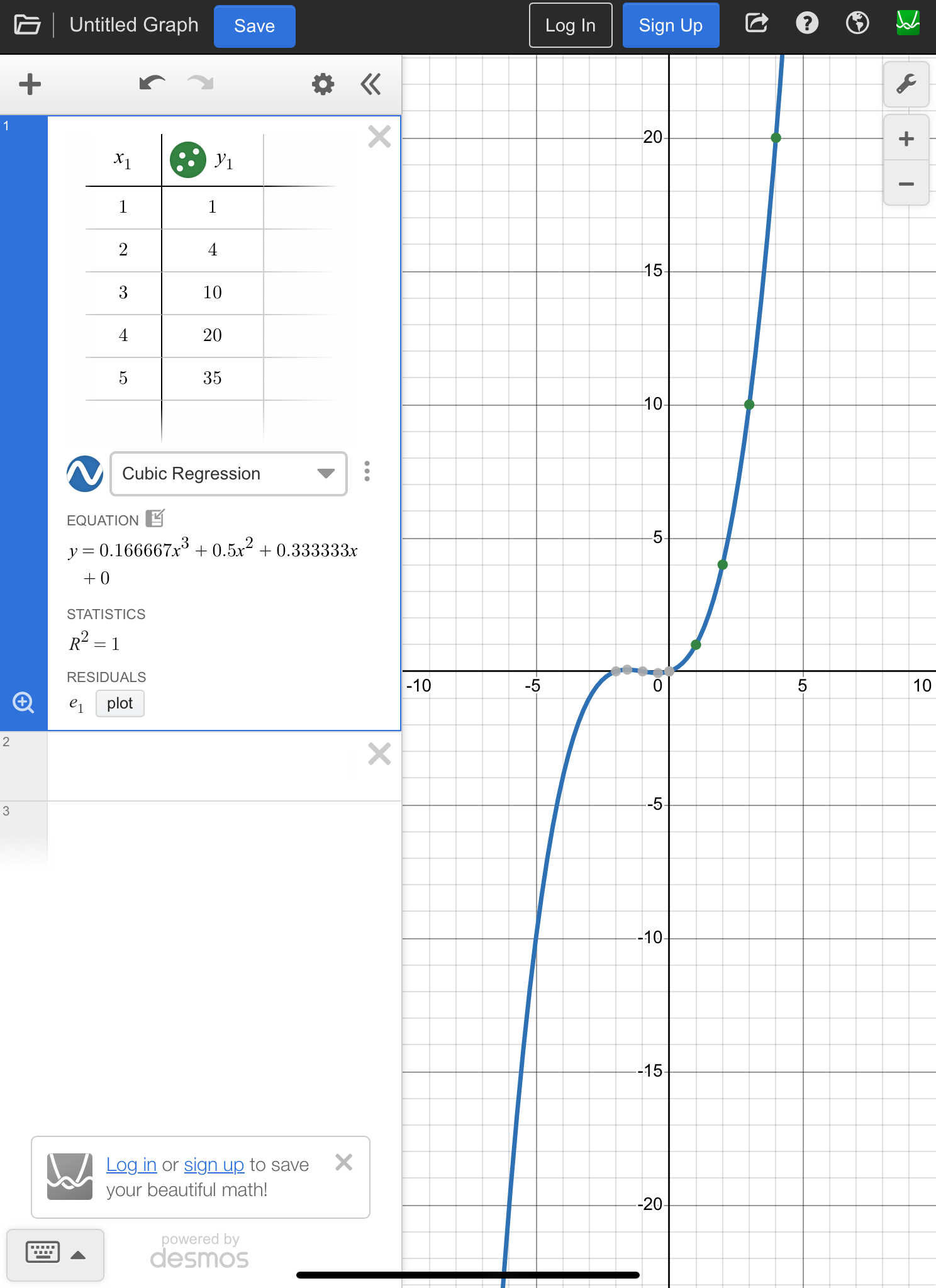 We worked on modelling the growth for this stack, and based on 3rd differences being the same, we think it is cubic. We start with 1 cup, then add successive triangle numbers as each row is added. We know that triangle numbers are a quadratic pattern, so it makes sense that it is cubic. Desmos can be used to do the regression for us.