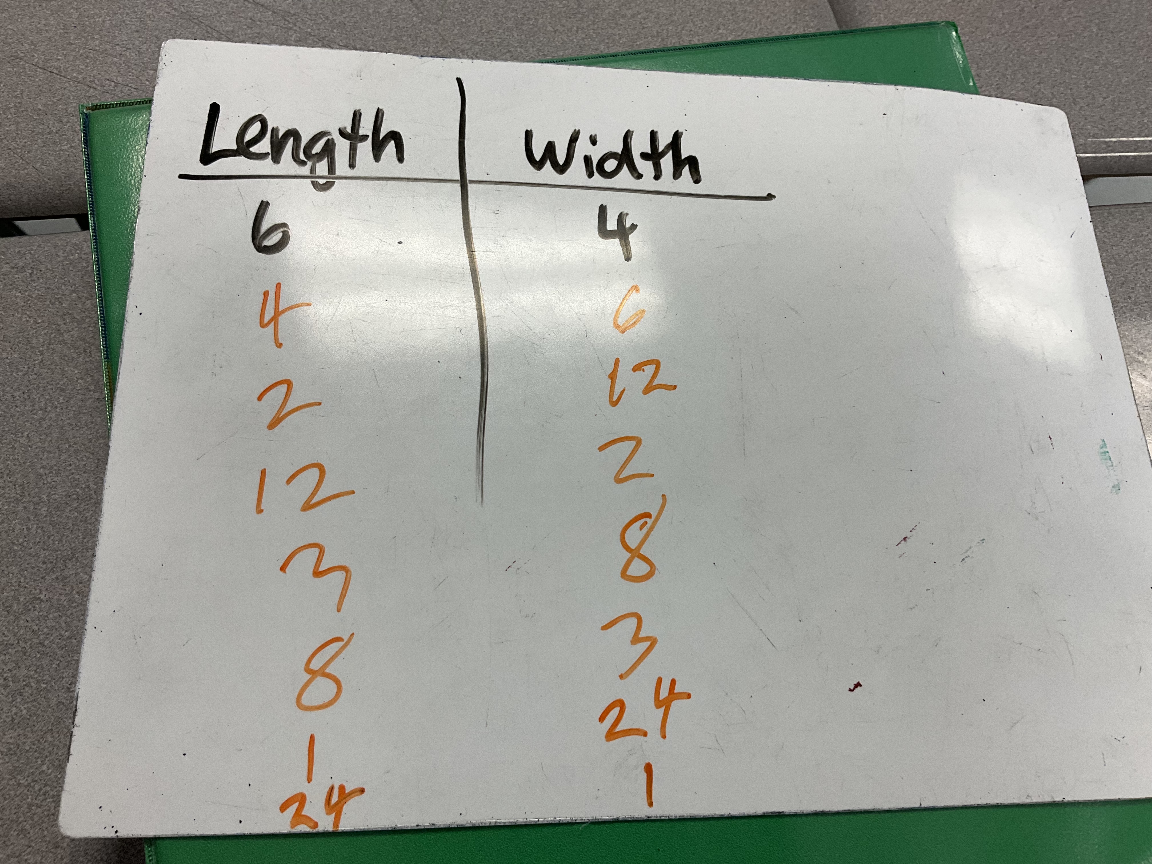 Some groups were interested in making 3D prisms, and we made the connection that the dimensions would be (2)(2)(6) or (2)(3)(4) and in both cases if you multiply those 3 values you get 24, which represents the volume of the prism.
