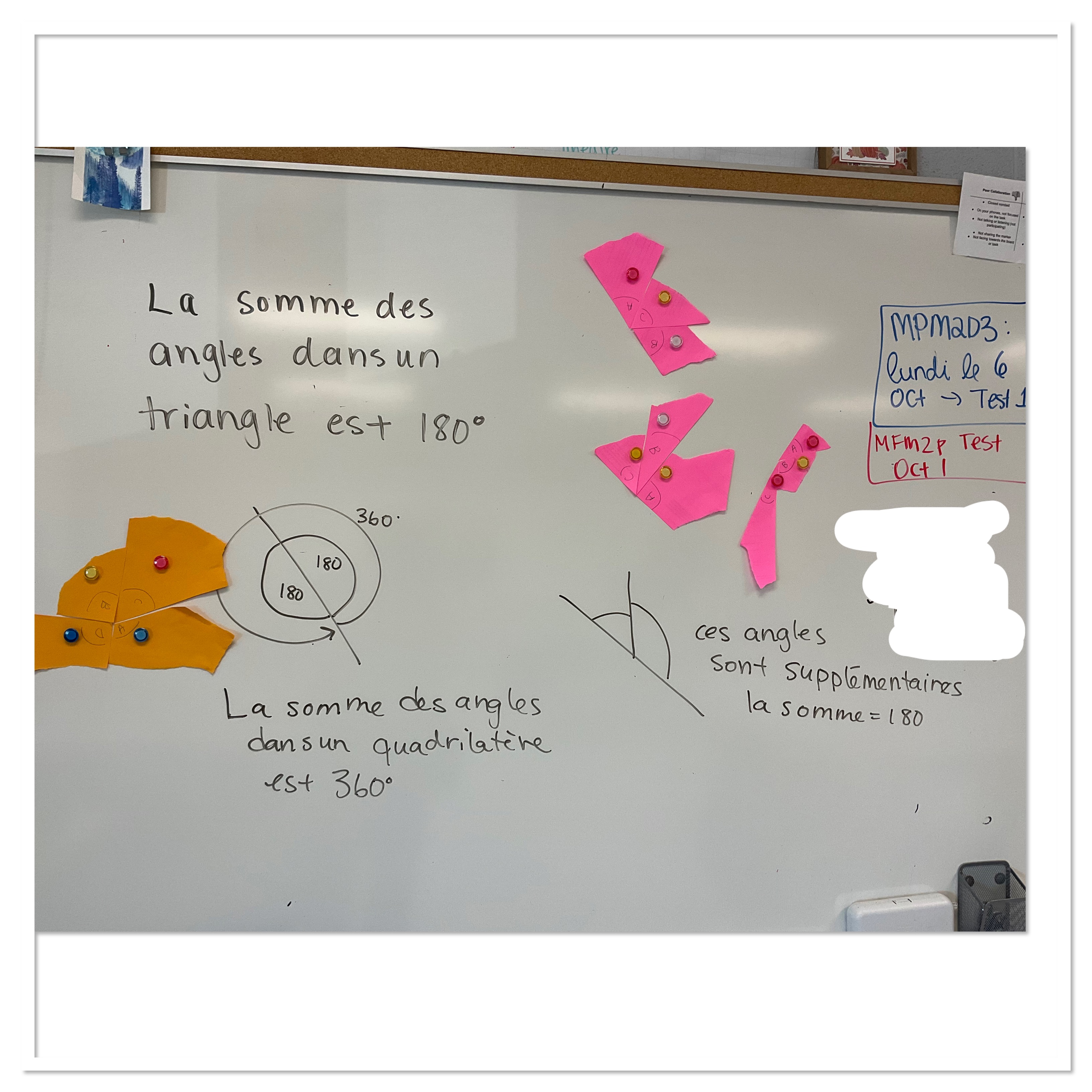 Today we looked at angle sums in grade 9. I don’t have a before picture, but I cut out some triangles, labelled their angles A,B,C, then ripped them up to put the angles all together to form a straight line.