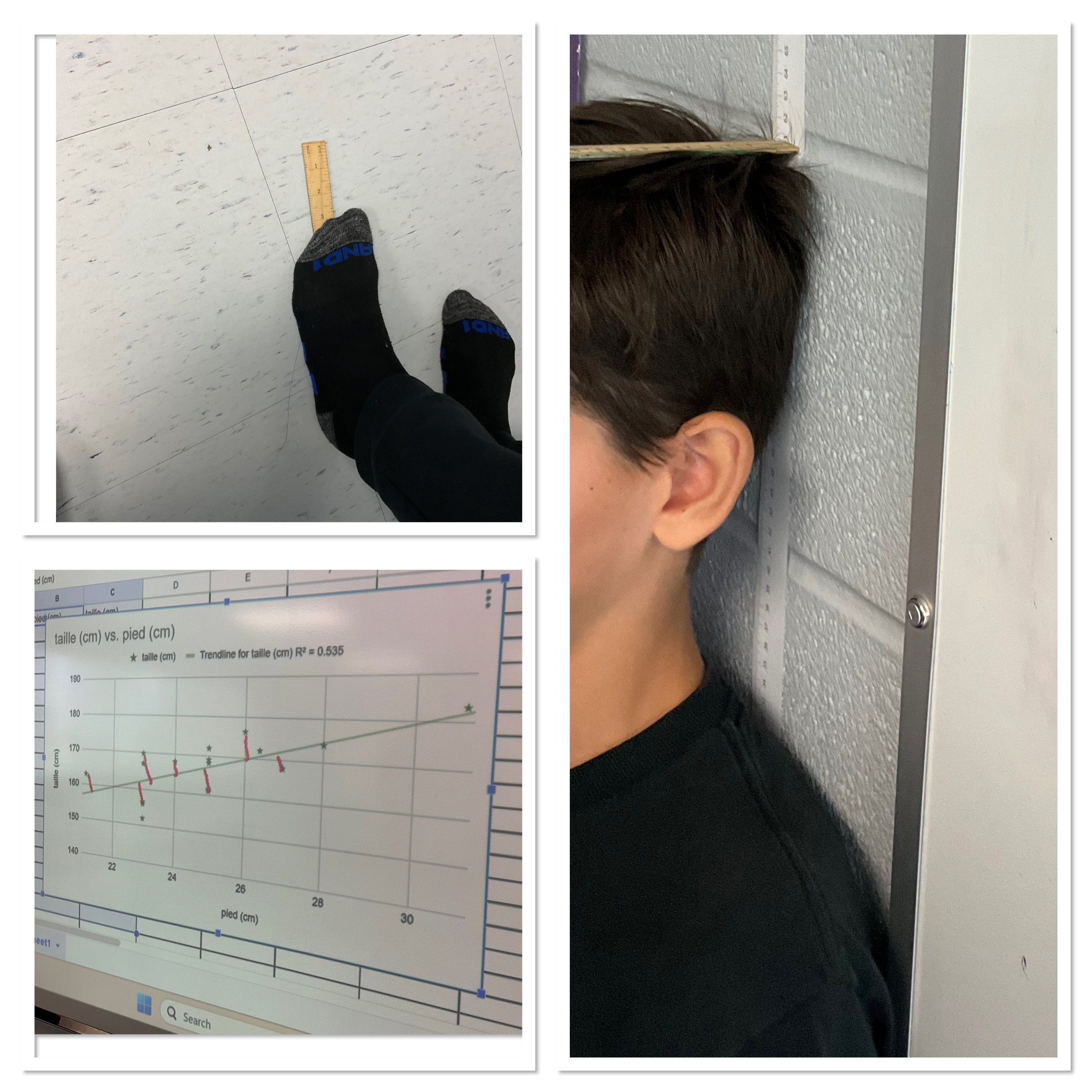 We taped ikea rulers to the wall, then took turns being measured. We stepped on rulers and measured our foot length too. Then we made a graph to see if it’s true that you can guess someone’s height by looking at their shoe size.