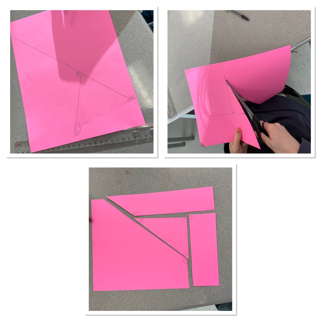 Today we did some work with angles. We drew triangles and extended sides to make exterior angles supplementary to the interior angles. We labelled these angles then cut out along the lines.