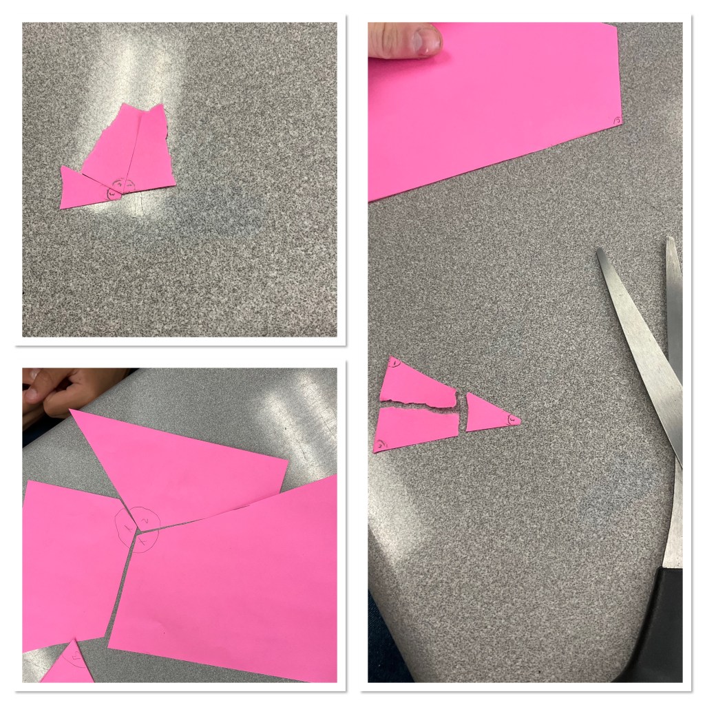 This left us with 4 pieces. We took the triangle and cut out the interior angles, and put them all together. We noticed that for all the triangles it made a straight line, 180 degrees.